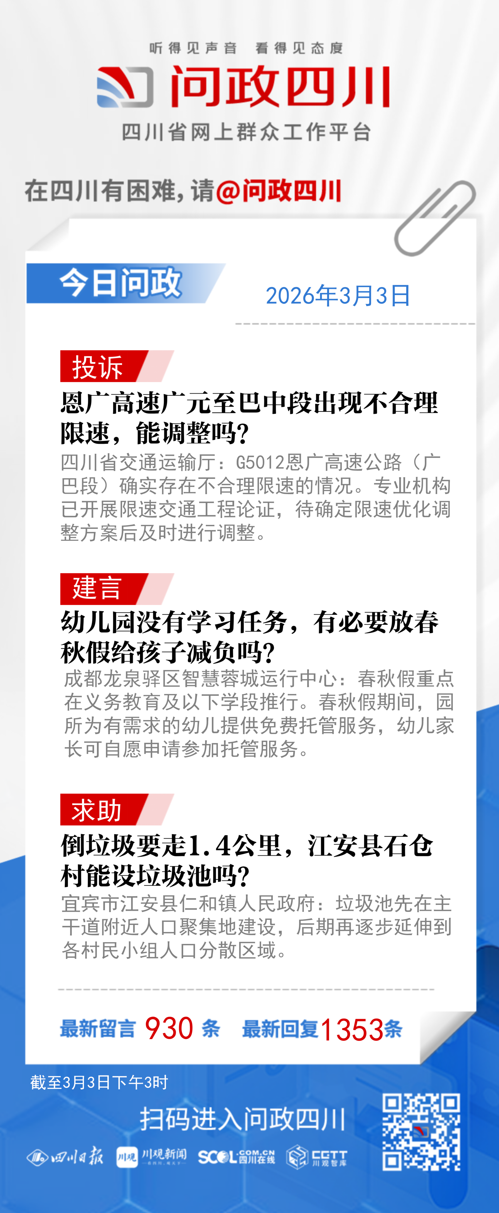 问政四川网友提问:我是成都市一名幼儿园孩子的家长,近期听闻孩子所在幼儿园也将放春假,我认为幼儿园没有放春秋假的必要性:幼儿无学业压力,无需借助春秋假减负休整;且幼儿正处于作息规律、行为习惯养成的关键阶段,频繁休假会中断其在园的稳定生活节奏,复学后需重新适应,不利于良好习惯的持续培养。春秋假期间,无配套的家长休假政策,低龄幼儿无自主生活能力,家长将面临误工、无人看护的现实育儿难题。希望教育部门重视这个问题,要么取消幼儿园春秋假安排,要么落实普惠性托管服务,切实解决家长的育儿困境。