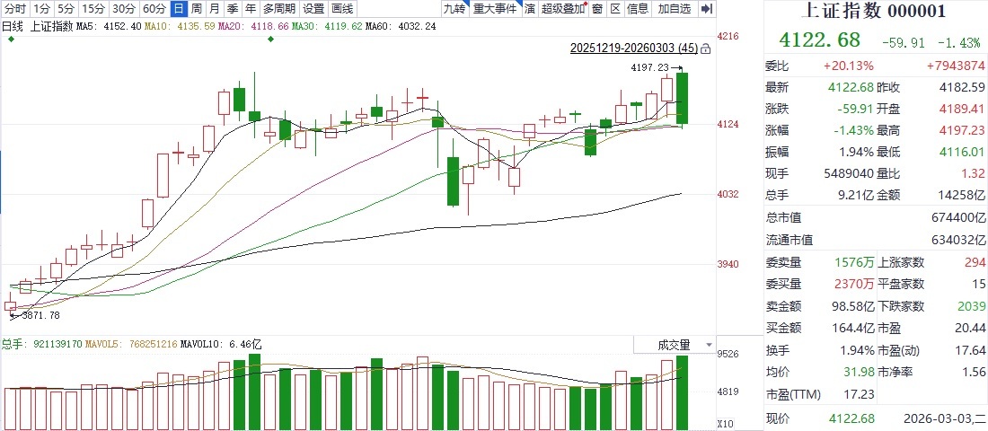 截至收盘,上证指数报收4122.68点,下跌1.43%;深证成指报收14022.39点,大跌3.07%;创业板指报收3209.48点,大跌2.57%。沪深北三市成交额达到3.16万亿元,较前一交易日小幅放量1118亿元。