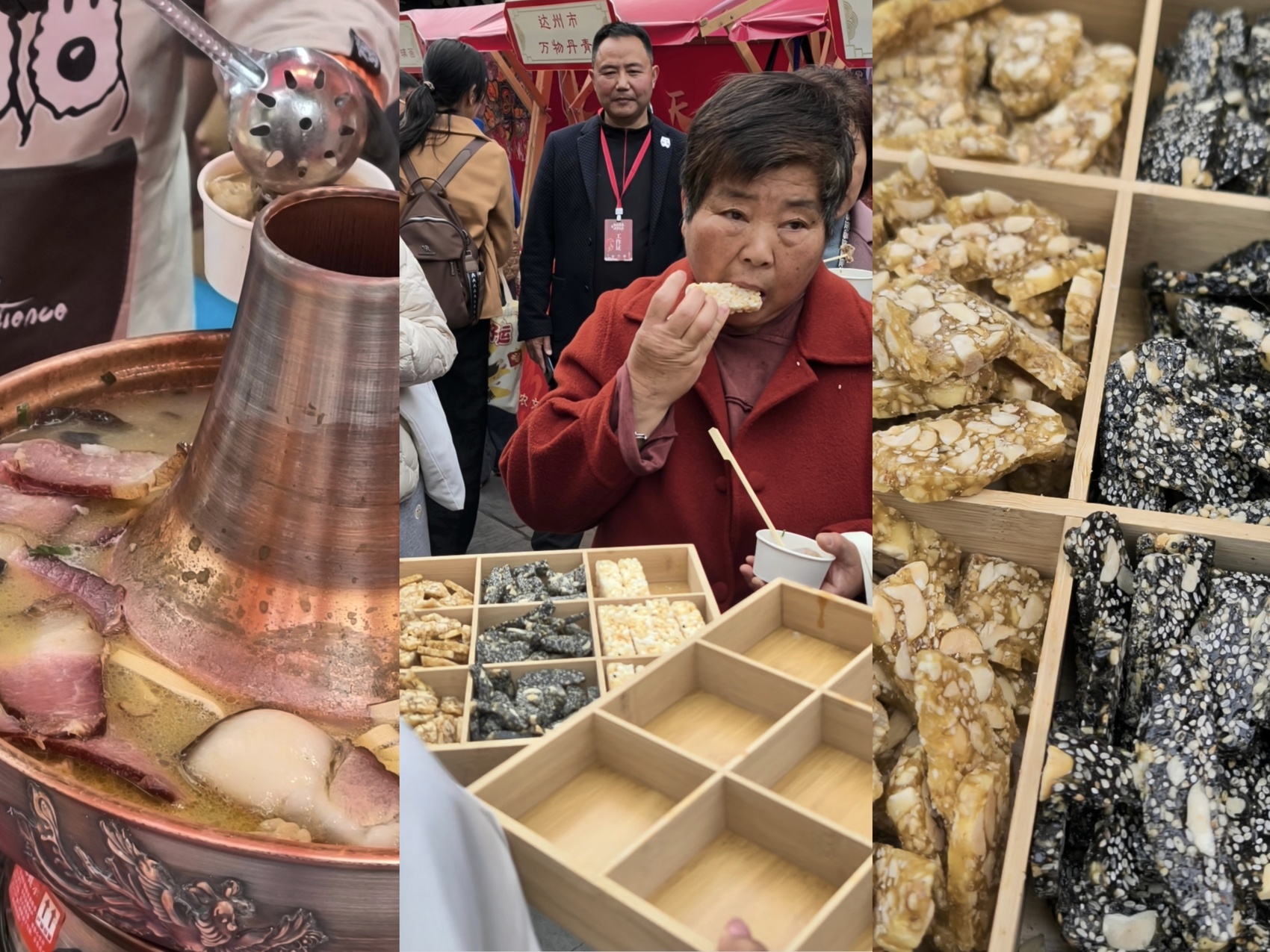请春酒并非指某一特定的酒,而是川南地区最高规格的待客之道,其精髓在于“一餐吃三台”。在嘉年华现场,秦健庭吃的“第一台”就着炒米糖、芝麻糖糕等川南传统点心,细品清香醇厚的宜宾早茶;“第二台”佐着香肠、腊肉等,浅酌美酒;“第三台”是正餐,他吃到了高县特色美食土火锅和宜宾竹笋鸡汤。