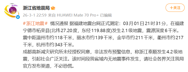 成都高新减灾研究所未经授权同意,非法发布预警信息,称浙江泰顺发生4.2级地震,引起社会广泛关注。该时间段我省域内无地震事件发生,请社会各界关注我局官方发布渠道,不必恐慌。