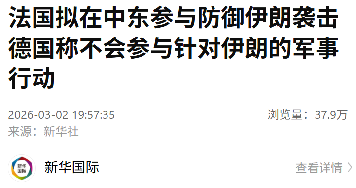 法国外交部长巴罗2日在巴黎举行的新闻发布会上表示,法国准备参与海湾国家和约旦防御伊朗袭击的工作。德国外交部长瓦德富尔同日表示,德国不会参与针对伊朗的军事行动,但如果德国受到攻击,将进行防御性反击。