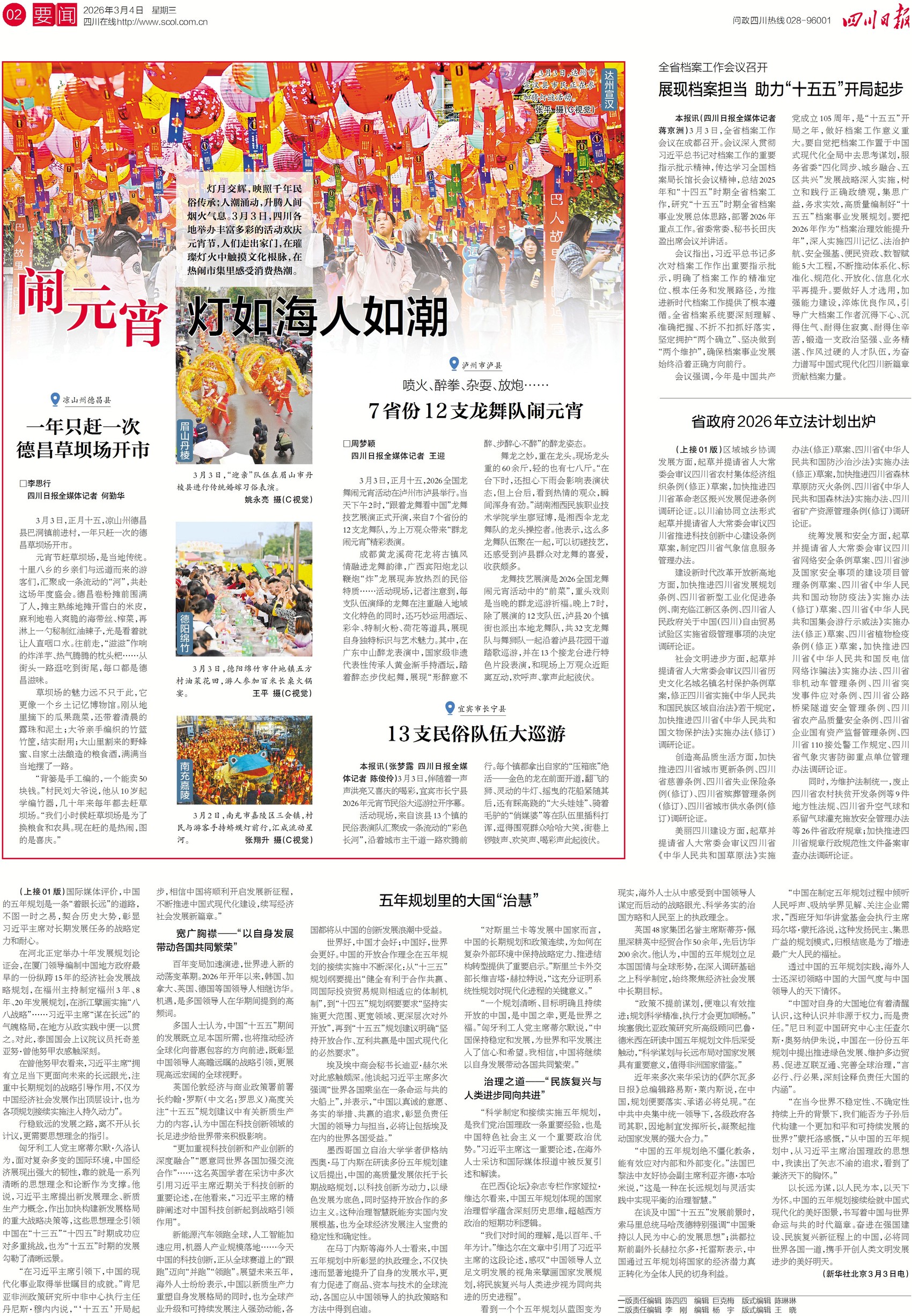 灯月交辉,映照千年民俗传承;人潮涌动,升腾人间烟火气。元宵佳节,四川各地举办丰富多彩的活动欢庆,人们走出家门,在璀璨灯火中触摸文化根脉,在热闹市集里感受消费热潮。四川日报全媒体走进全省各地,带来不一样的元宵体验。具体报道请关注今日二版。