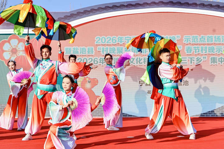 彩扇翩翩摇曳,欢声笑语盈场。近日,2026年宁夏“四季村晚”示范点首场演出暨盐池县“村晚聚乡情 非遗贺新春”春节“村晚”示范点展示活动勾勒出一幅鲜活生动的乡村年俗画卷。