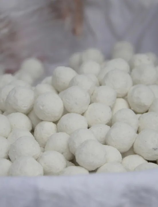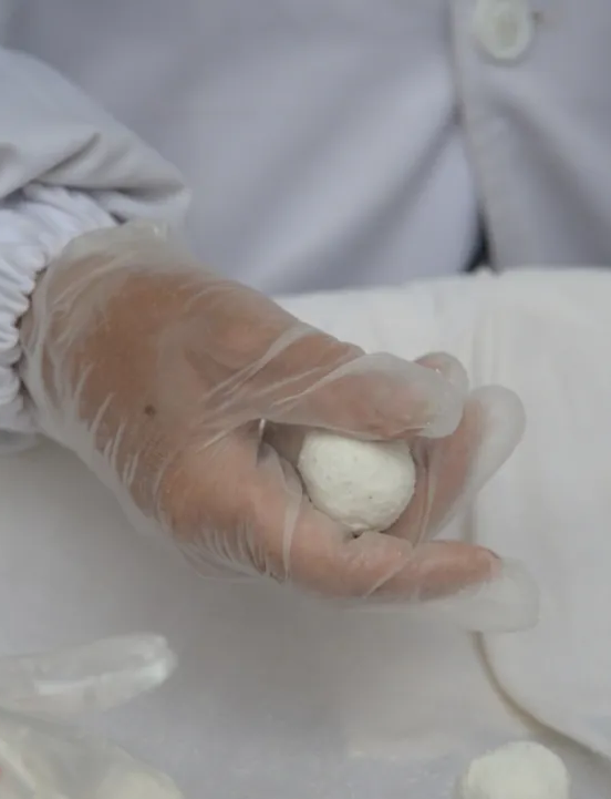 将桂花、黑芝麻、松子等六种原料锤成方馅,蘸水、入粉、滚动、过筛,像滚雪球一样反复七次,才有了这外皮弹韧、内馅有嚼劲的独特口感。