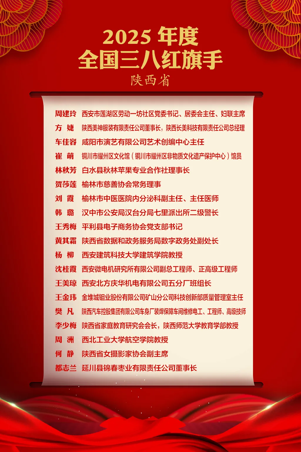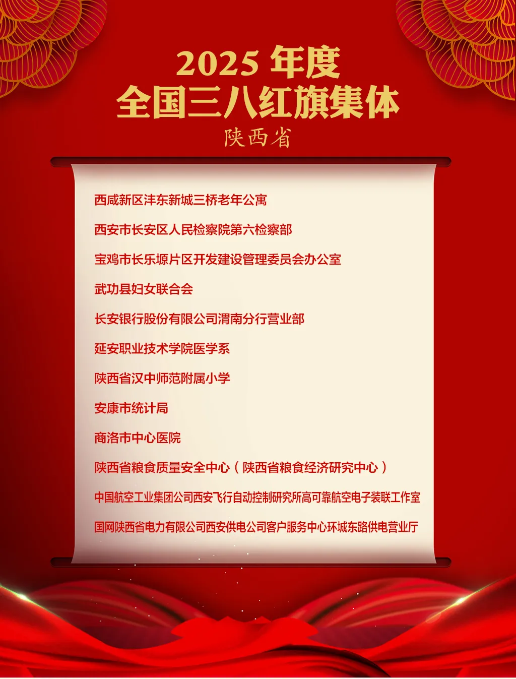 我省周建玲等19人荣获全国三八红旗手称号,西咸新区沣东新城三桥老年公寓等12个集体荣获全国三八红旗集体称号,西咸新区斗门街道斗门社区(原长安区斗门街道斗门社区居委会)等15个单位荣获全国巾帼文明岗称号。