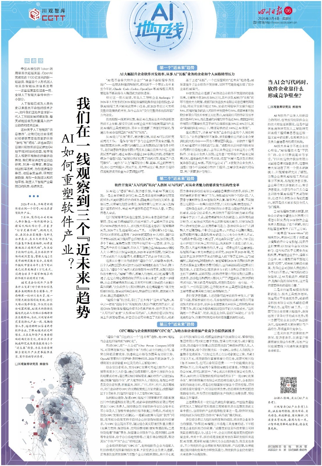 导读:当黄仁勋将写代码比作打字,当马斯克表示将来我们甚至不再需要编程之时,AI会不会抢程序员的饭碗?四川日报《AI地平线》月刊首期主稿《AI如何重塑软件产业?我们在一线观察到3个“近未来”趋势》对此进行了探讨。