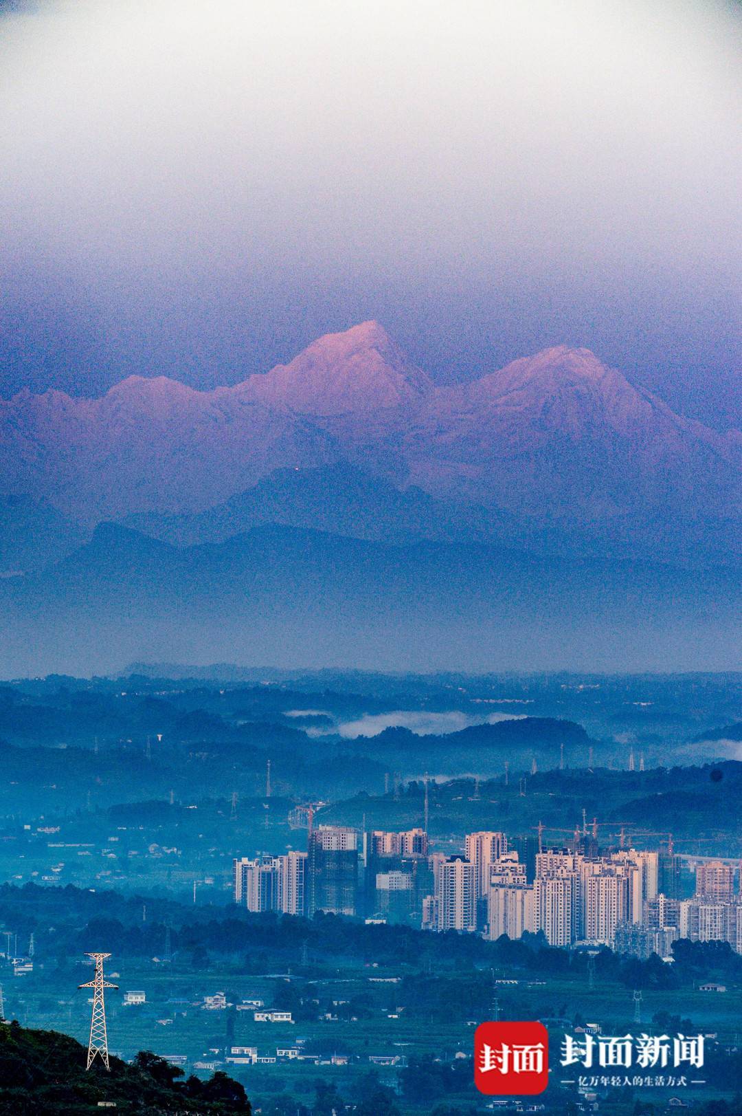成都作为千万级人口的大城市,从天府广场到贡嘎山直线距离200多公里。站在合适的点位,镜头可以拍下眼前的茶园、果园,远处的平原、丘陵,三、四千米的低山,最后是七千多米的贡嘎主峰,层层叠叠的景致浓缩在一个画面里,那是一种难以言表的震撼感。