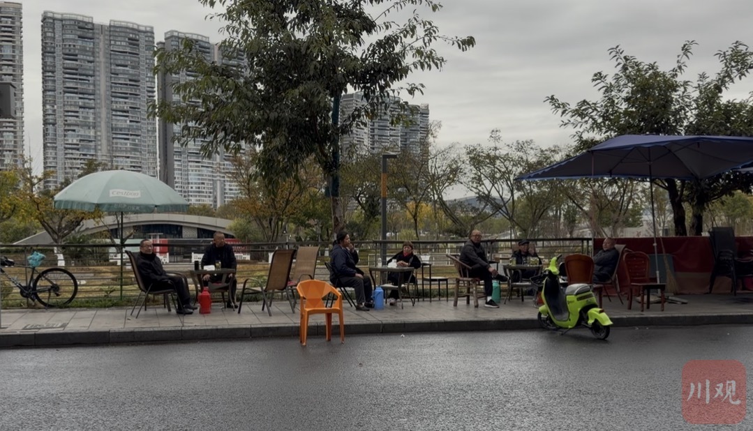 滨河中路一带,遍布社区茶馆,大家共用公共院坝,摆布茶桌椅子。