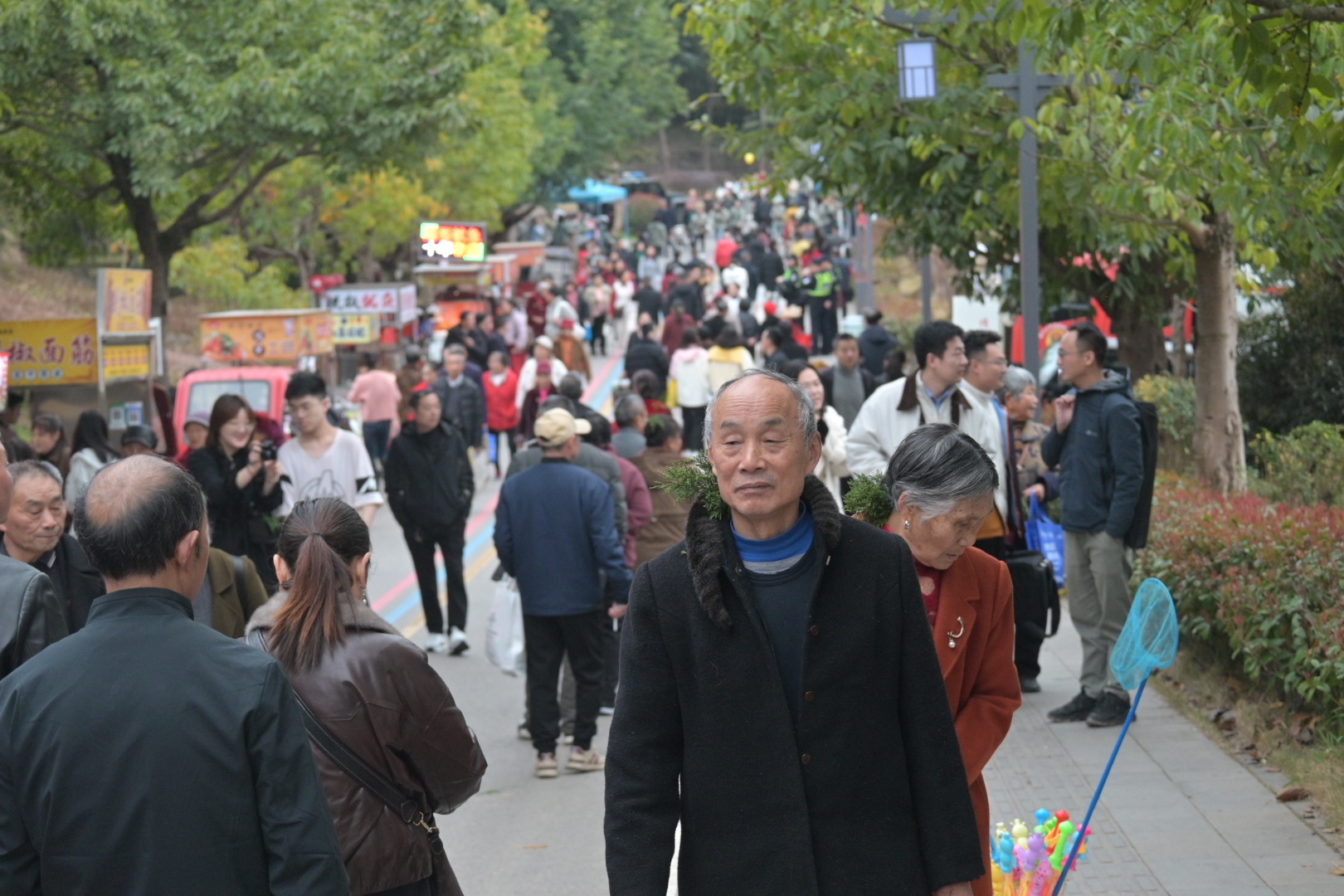 虽是阴天,却丝毫挡不住市民参与的热情。山间步道上人潮涌动,市民扶老携幼、结伴而行,拾级而上、沿途欢声笑语不断。大家头上插一支柏桠,虔诚祈福,尽享民俗之乐、登山之趣。