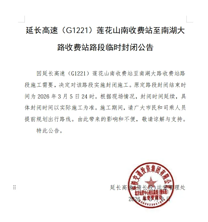 据吉行高速微信公众号,因施工,延长高速(G1221)莲花山南收费站至南湖大路收费站路段临时封闭,具体如下: