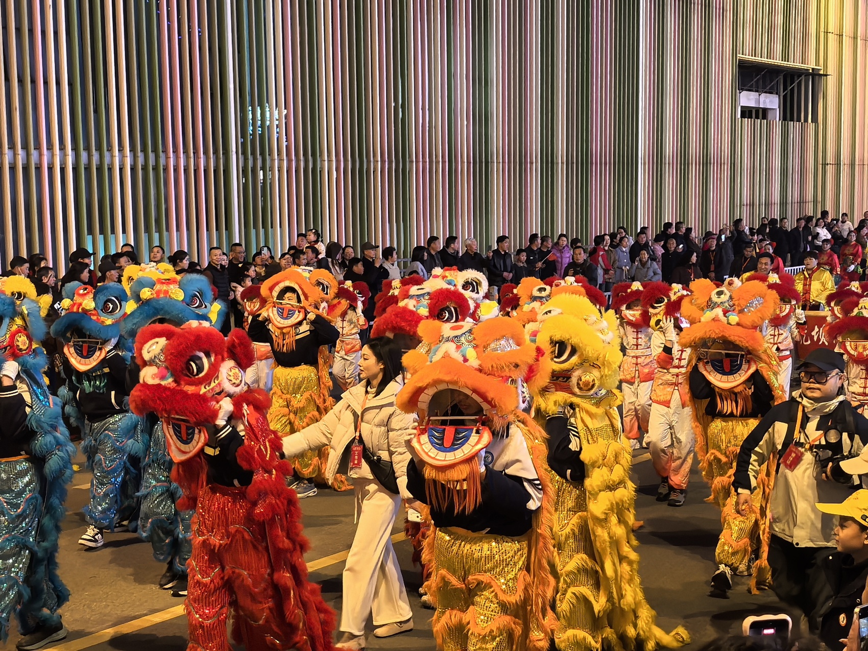 夜幕降临,华灯璀璨,苍溪县美好广场幸福路十字路口早已人头攒动。龙腾狮舞、机器人表演等融合传统非遗、民俗文化与现代科技的精彩表演接连上演。陵江镇独角兽方阵气势恢宏,神兽昂首摆尾、灵动俏皮;云峰镇威风锣鼓队鼓点铿锵、声势震天;漓江高跷演员脚踏高跷步履稳健,花式表演引得现场观众阵阵欢呼;元坝狮舞腾空跳跃、翻滚登高、灵巧采青,精湛绝伦的技艺让现场喝彩声不断;永宁火龙气势磅礴、烈焰升腾,尽显非遗民俗的震撼魅力。