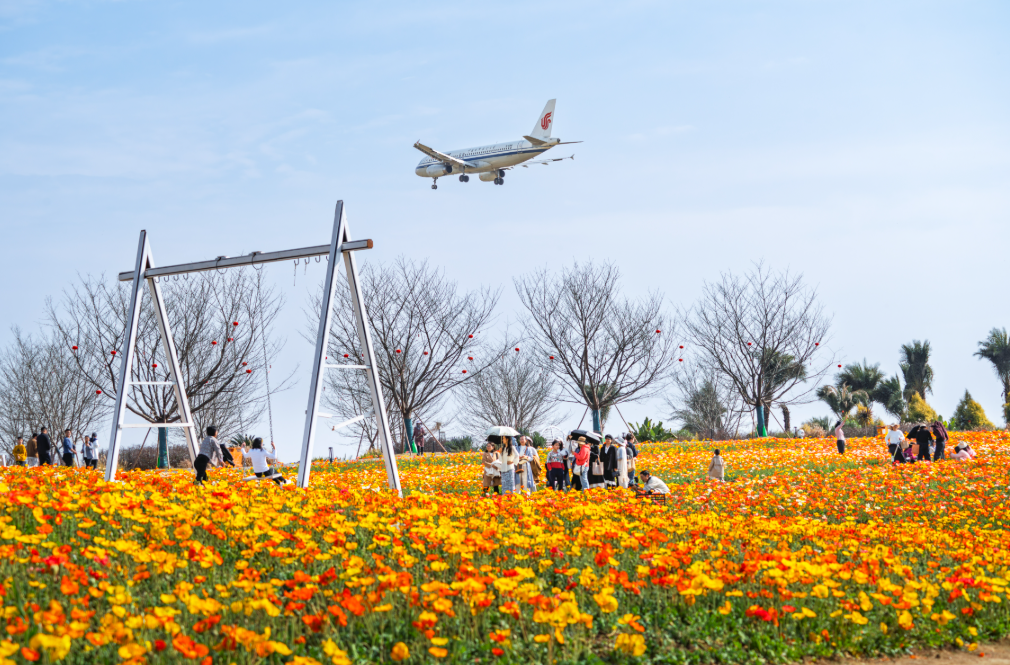 作品简介:节日期间,空港花田大片的虞美人在蓝天白云下肆意绽放,飞机的银翼从花海上空低低掠过,与游人的欢声笑语织成一曲春日的序章。
