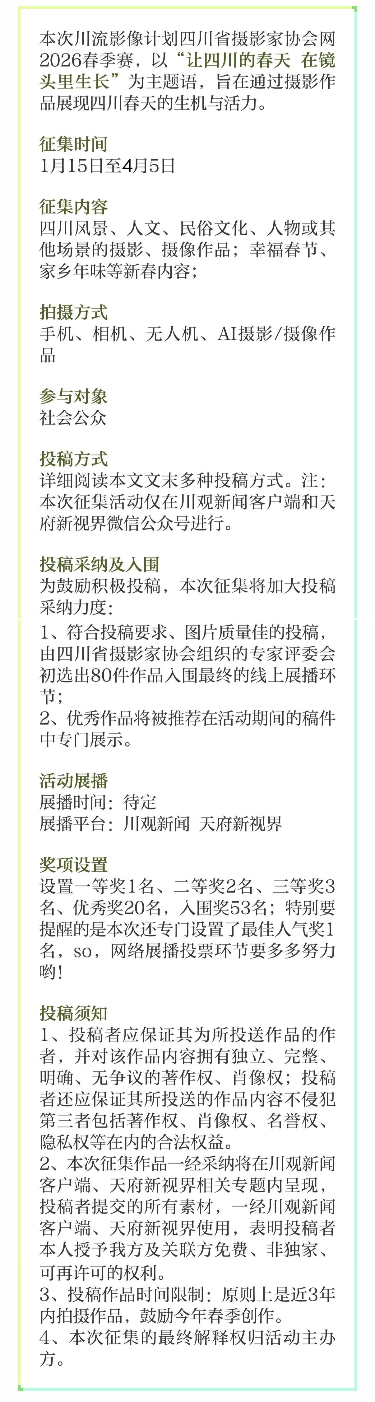 川流影像计划2026春季赛仍在持续征稿中。包括四川的风景、人文、民俗文化、人物或其他场景的摄影、摄像作品,以及幸福春节、家乡年味等新春内容。无论你是专业摄影师还是摄影爱好者,都能在这个比赛中找到属于自己的舞台。