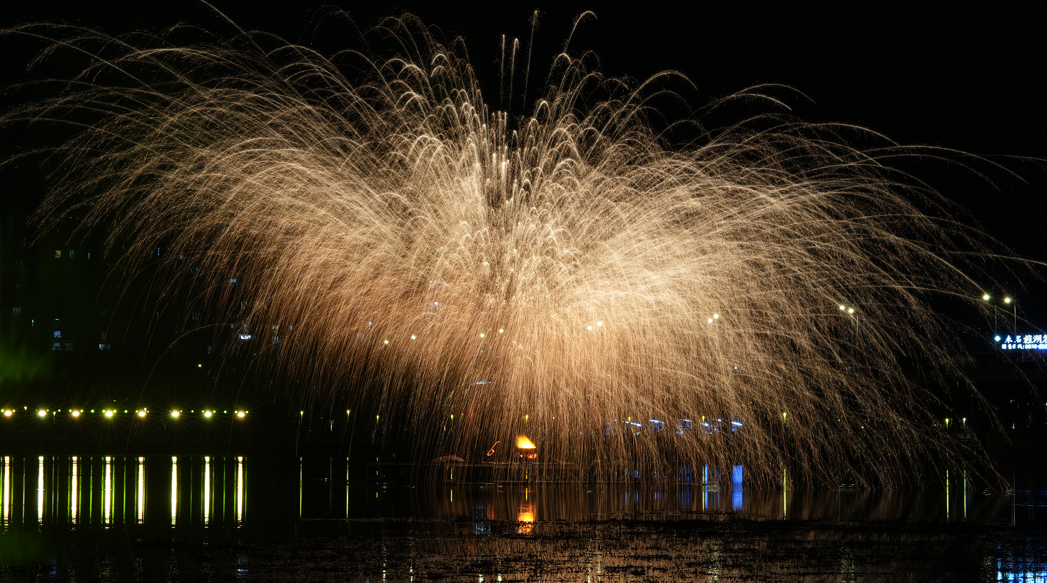作为夜间盛典的预热高潮,非遗打铁花表演在临水区域震撼上演。与此同时,无人机群同步升空,以夜空为幕布,拼出各类图案,与旌湖湖面倒影交相辉映,现场观众纷纷举起手机记录这一震撼瞬间。