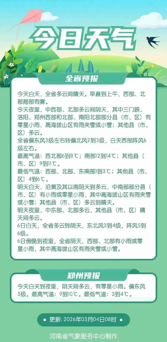省会郑州紧随全省天气节奏,3月4日多云间阴天,有零星小雨,5日转晴,6日再度转阴,气温平稳起伏,日常穿搭无需大幅调整。