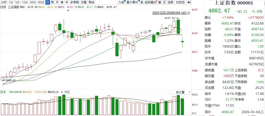 截至收盘,上证指数报收4082.47点,下跌0.98%;深证成指报收13917.75点,下跌0.75%;创业板指报收3164.37点,下跌1.41%。成交量方面,沪深京三市合计成交额达到23882亿元,较前一交易日缩量接近7700亿元。