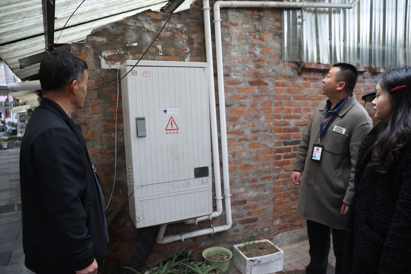 荥经县纪检监察干部深入街巷,查看电路及新电表箱安装情况,确保改造工程落地见效、惠及群众。