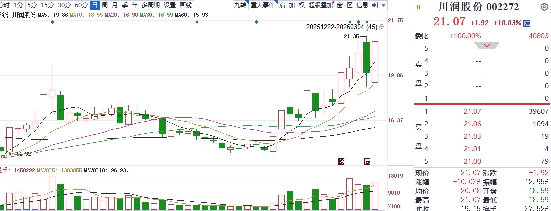 机构投资者的大举买入,一定程度上提振了市场信心。3月4日,川润股份小幅低开后直线飙升,短短3分钟时间股价便被推升至涨停板上。虽然股价随后出现波动,但午后仍将涨停板封死。截至收盘,川润股份报收21.07元,上涨10.03%。