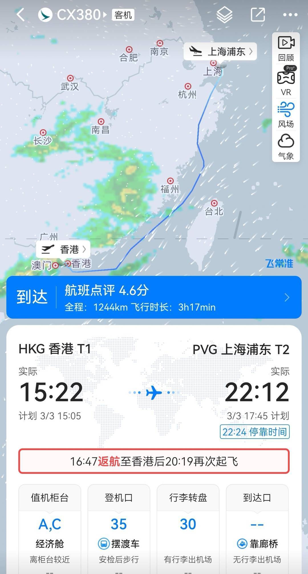 国泰航空的工作人员告诉记者,该航班因技术原因于起飞后按既定程序折返香港,后续已调配另一架飞机执行该航班任务,于3月3日22:24安全抵达上海浦东国际机场。