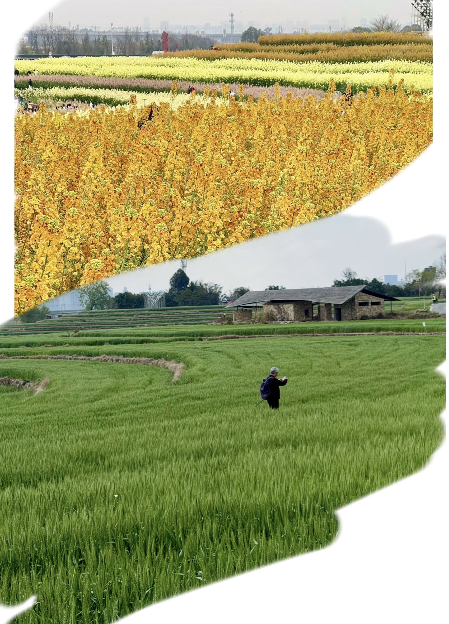 上图为往年的油菜花,2026年替换成了下图的麦田