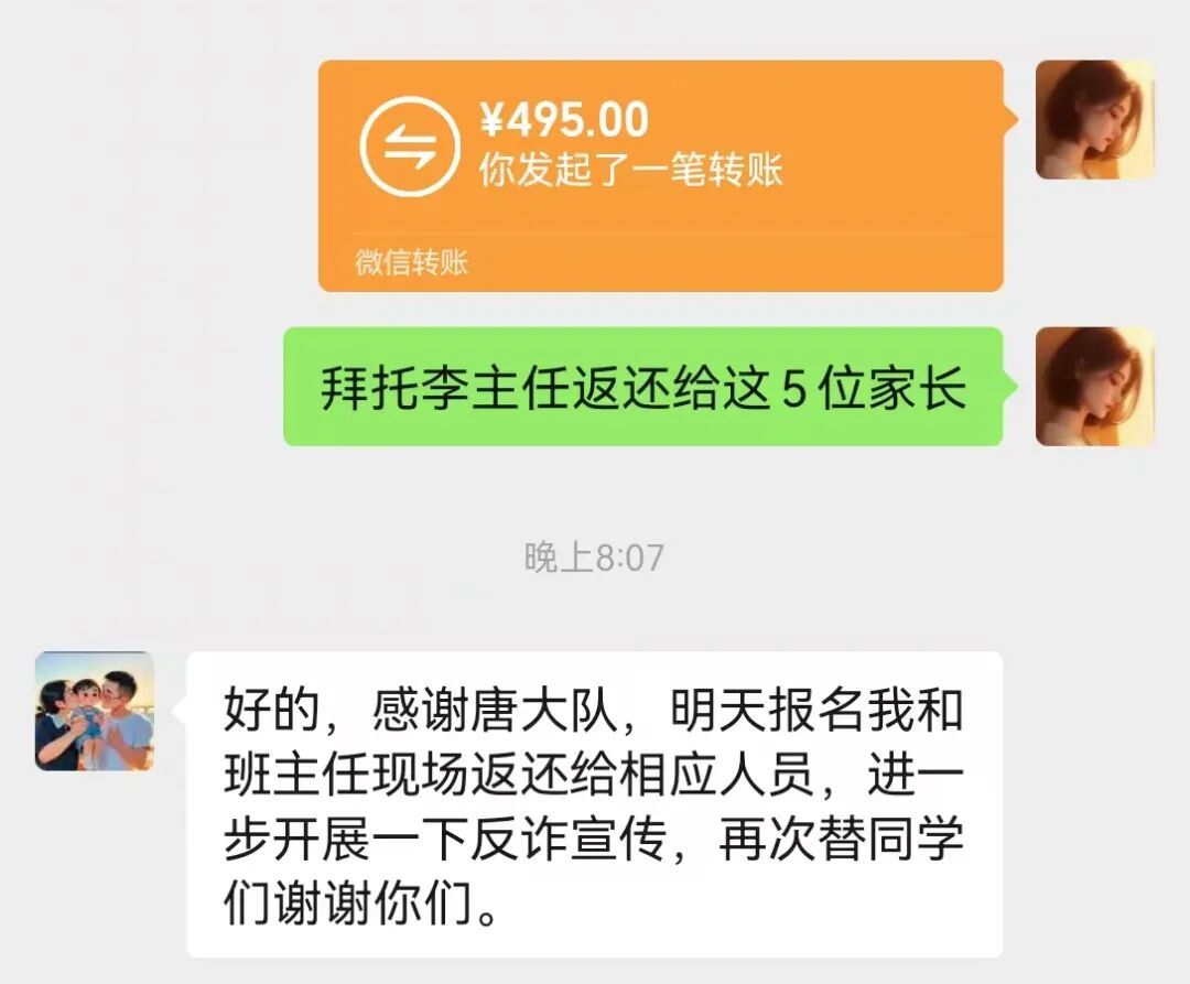 “根据资金流向,锁定赃款最终汇入广东茂名一何姓男子账户中。”岳池县公安局网安大队大队长唐娟介绍,核查出违法嫌疑人真实身份信息后,立即联系其所在地公安机关,协助追回被骗钱财,通过4小时的追踪工作,最终及时将5名被骗学生家长的495元成功追回。