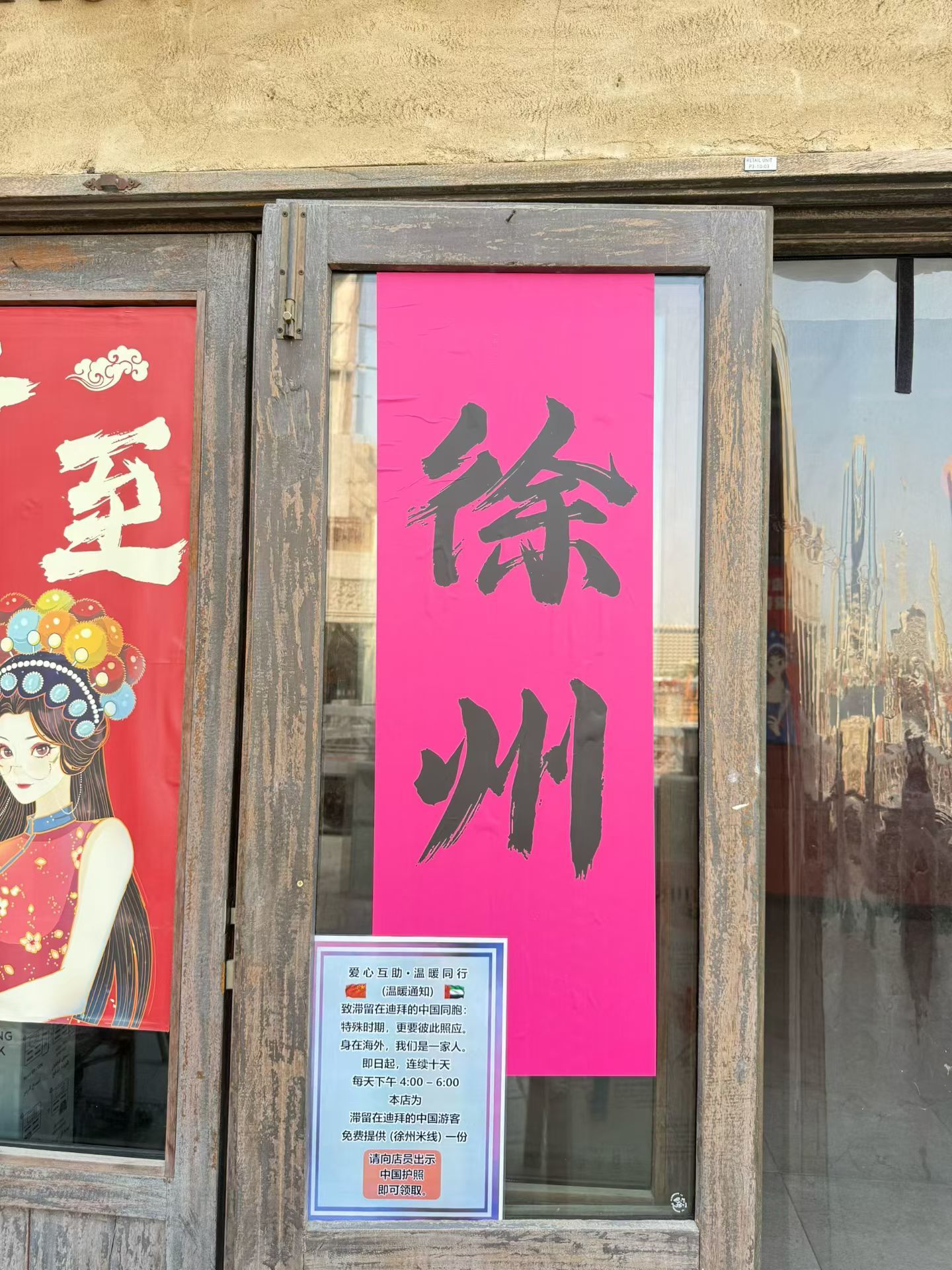 杨涛的店外,张贴的告示上面写着“身在海外,我们是一家人”