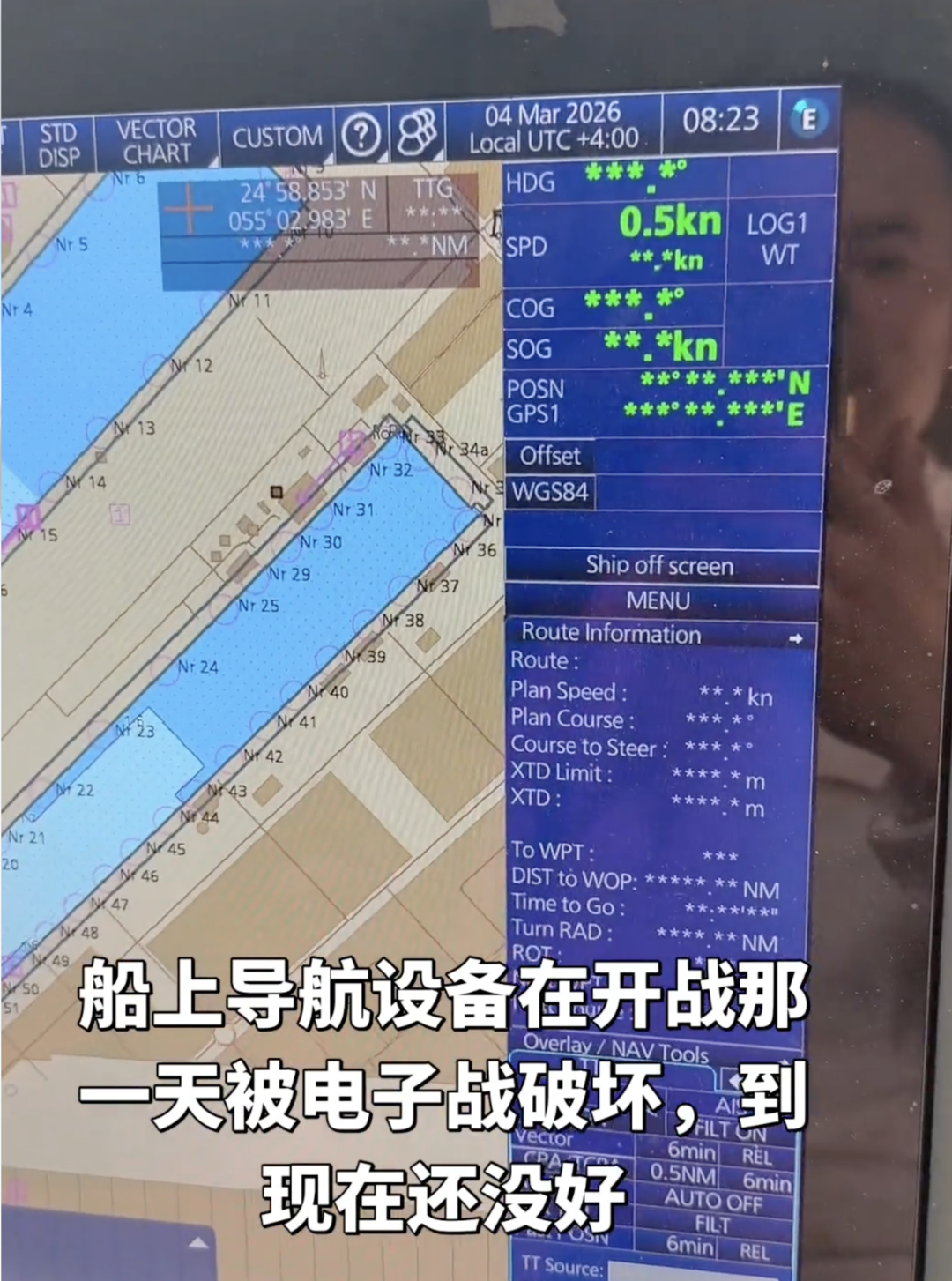 2月28日以来,三位受困于波斯湾内的中国海员均向封面新闻记者表示,自己所在船舶的导航系统在战事发生后失灵,GPS信号提供的位置大幅偏移、时间也不准确,影响船舶的安全行驶,受安全局势影响,波斯湾内的部分港口一度暂停商船停靠补给,如果得不到补给,船上食物只能坚持一个月左右。
