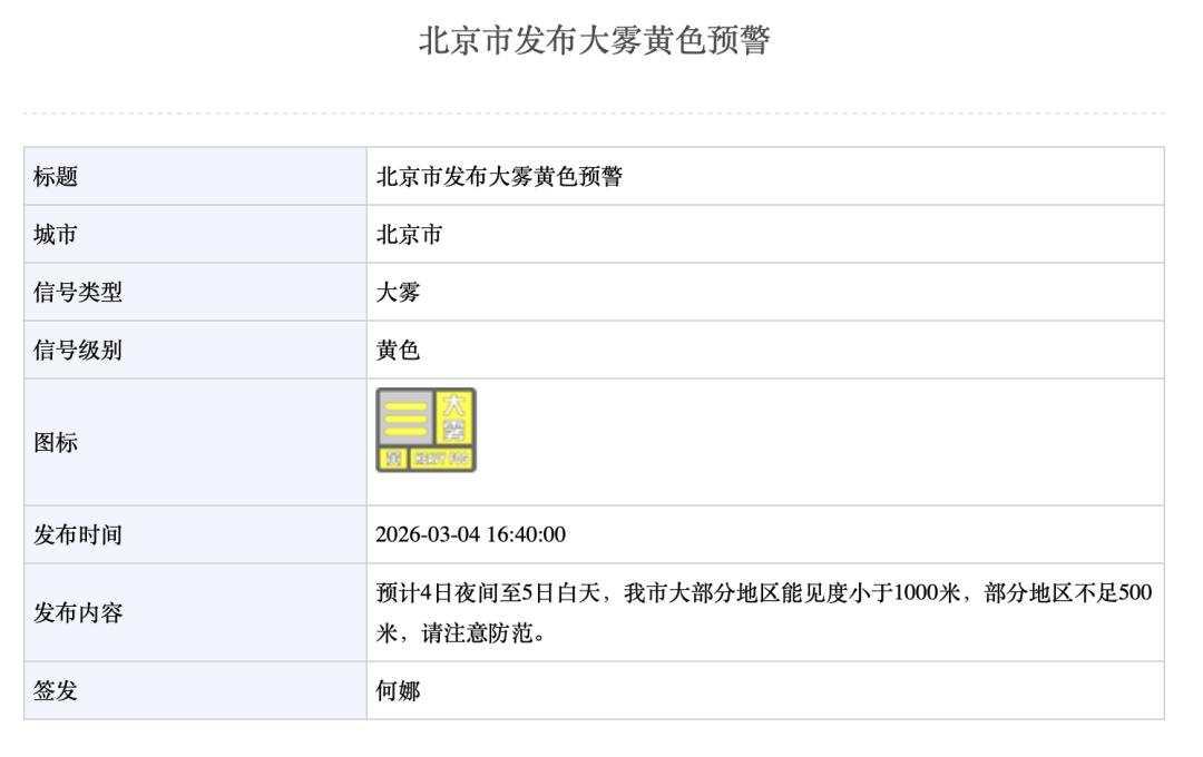 3月4日下午,北京市气象局发布大雾黄色预警:预计4日夜间至5日白天,本市大部分地区能见度小于1000米,部分地区不足500米,请注意防范。