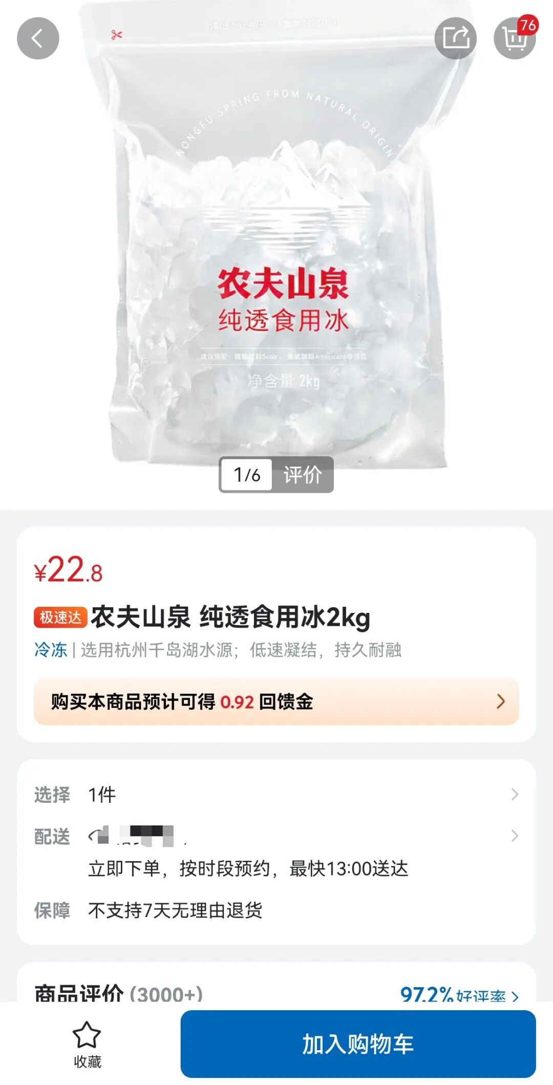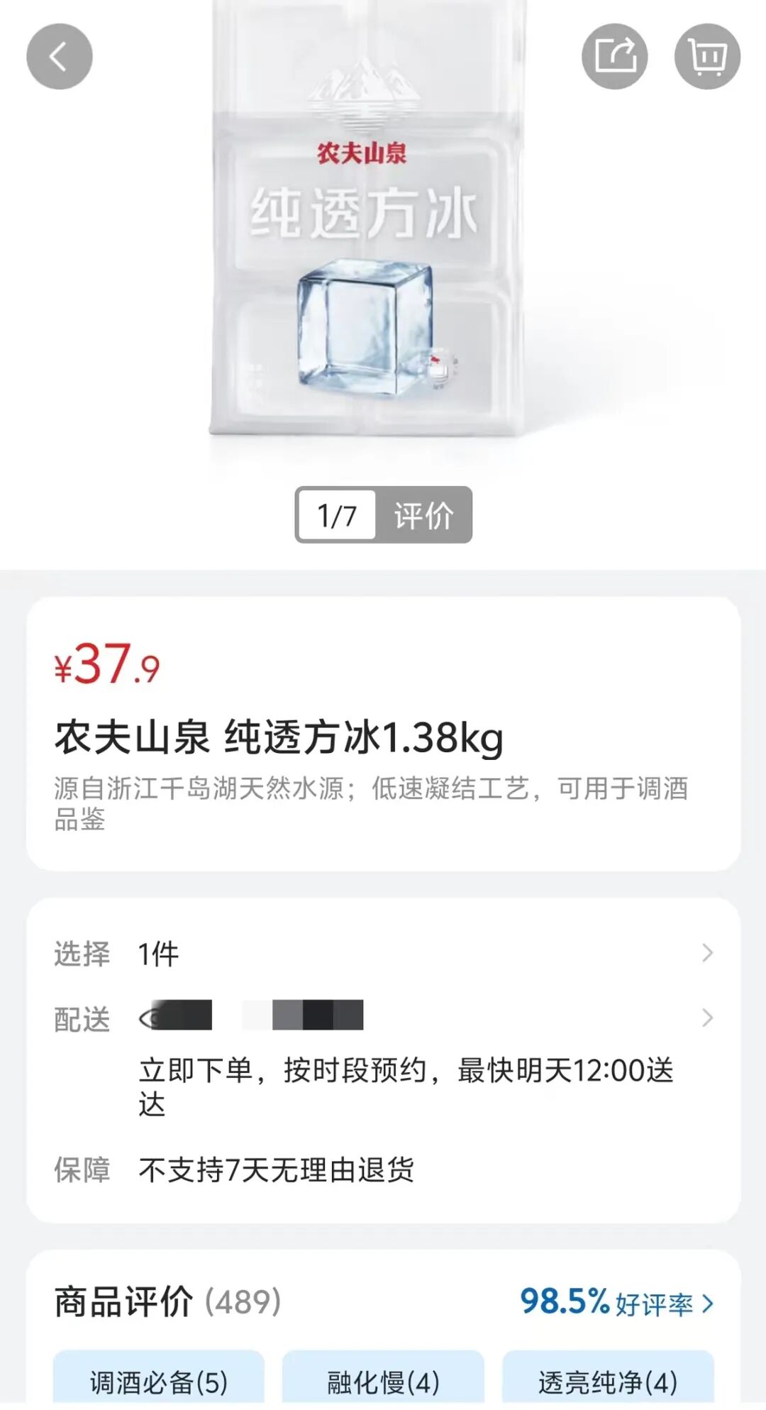 记者通过山姆会员商店App查询发现,确有该款冰块产品在售。产品名称为农夫山泉纯透方冰1.38kg,售价为37.9元,详情页介绍这款产品历经约42至48小时才得到纯透美观的方冰,不易融化,为专业品酒设计。