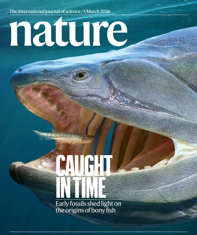 △Nature封面。重庆始骨鱼(小鱼)和钝齿宏颌鱼(大鱼)三维复原图。
