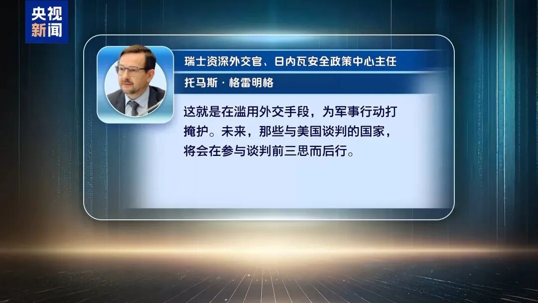 瑞士资深外交官、日内瓦安全政策中心主任托马斯·格雷明格批评称,这就是在滥用外交手段,为军事行动打掩护。他警告称,未来,那些与美国谈判的国家,将会在参与谈判前三思而后行。