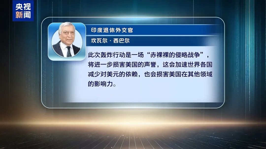 印度退休外交官坎瓦尔·西巴尔表示,此次轰炸行动是一场“赤裸裸的侵略战争”,将进一步损害美国的声誉,这会加速世界各国减少对美元的依赖,也会损害美国在其他领域的影响力。