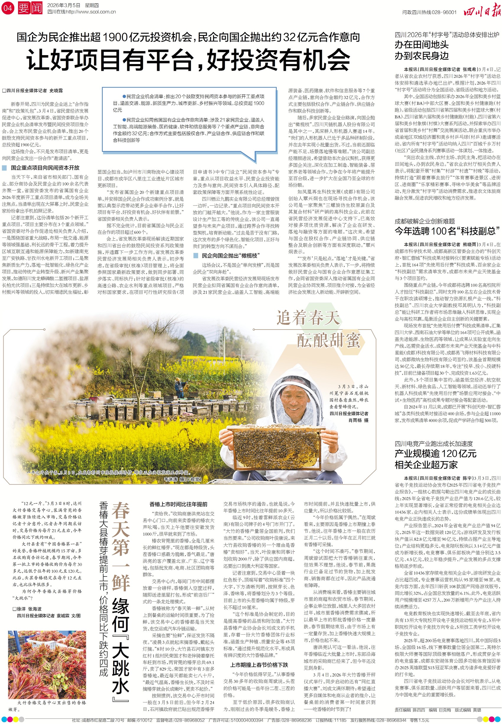 3月4日,四川多个省级部门联合向民营企业发出一份合作“邀请函”,推出20个鼓励支持民间资本参与的新开工重点项目,总投资超1900亿元。与此同时,21家民企向国企抛出“橄榄枝”,涵盖7个重点产业链,意向合作金额超过30亿元。关注今日四版,见证这场四川国企和民企的“双向奔赴”。