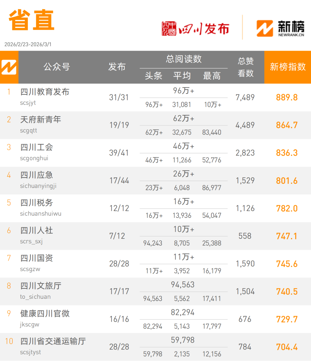 榜单整理了目前四川地区政务微信公众号排行情况,由新榜提供数据支撑,由四川发布在四川地区独家权威发布,包括省直部门、市(州)、县(区、市)三大类,每周发布。
