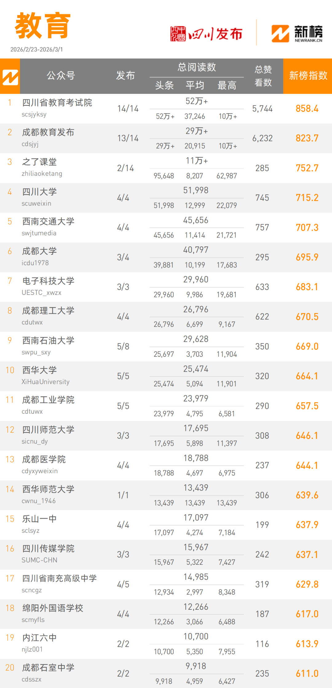 “四川教育考试院”本周以520000+次阅读量总数,858.4新榜指数领跑教育类榜单,“成都教育发布”本周以290000+次阅读量总数,823.7新榜指数获得教育类榜单第二名。