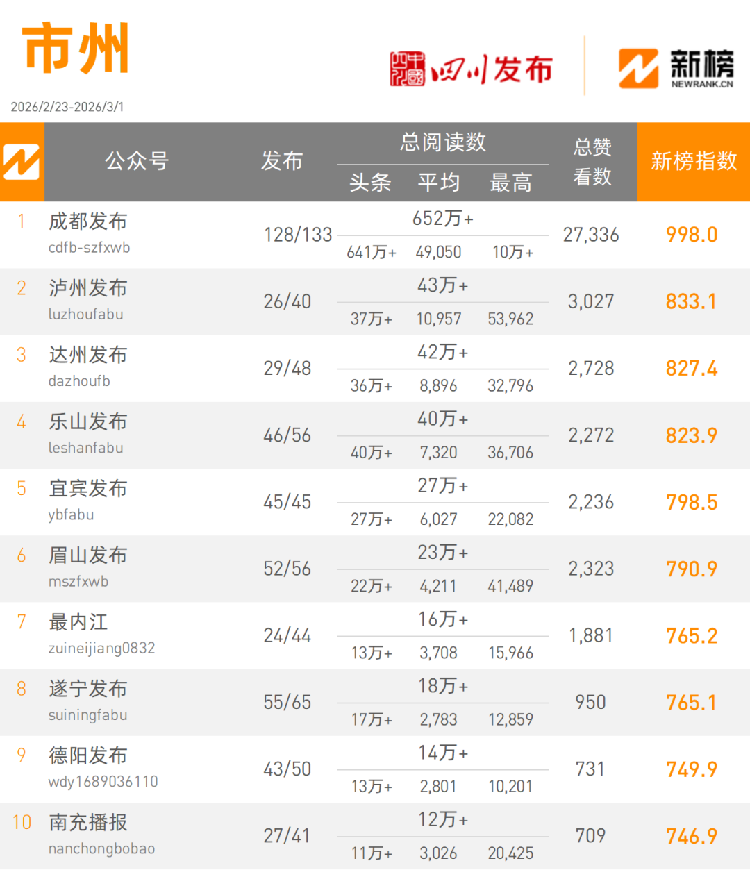 在本周(州)榜单中,“成都发布”发文133篇,以6520000+次阅读量总数998.0新榜指数摘得市州类榜单桂冠;“泸州发布”发文40篇,以430000+次阅读量总数,833.1的新榜指数获得市(州)类榜单亚军。