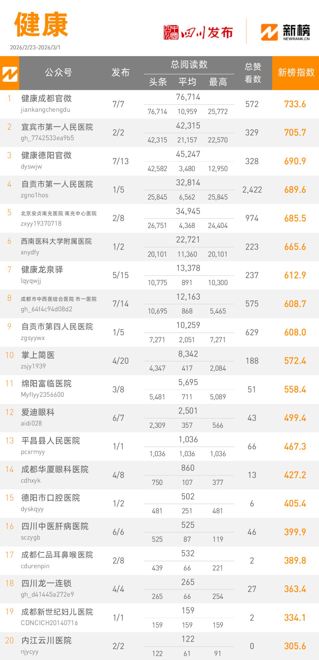 “健康成都官微”本周以76714次阅读量总数,733.6的新榜指数占据健康类榜单冠军宝座,“宜宾市第一人民医院”凭借42315阅读量总数,以705.7的新榜指数获得健康类榜单亚军。