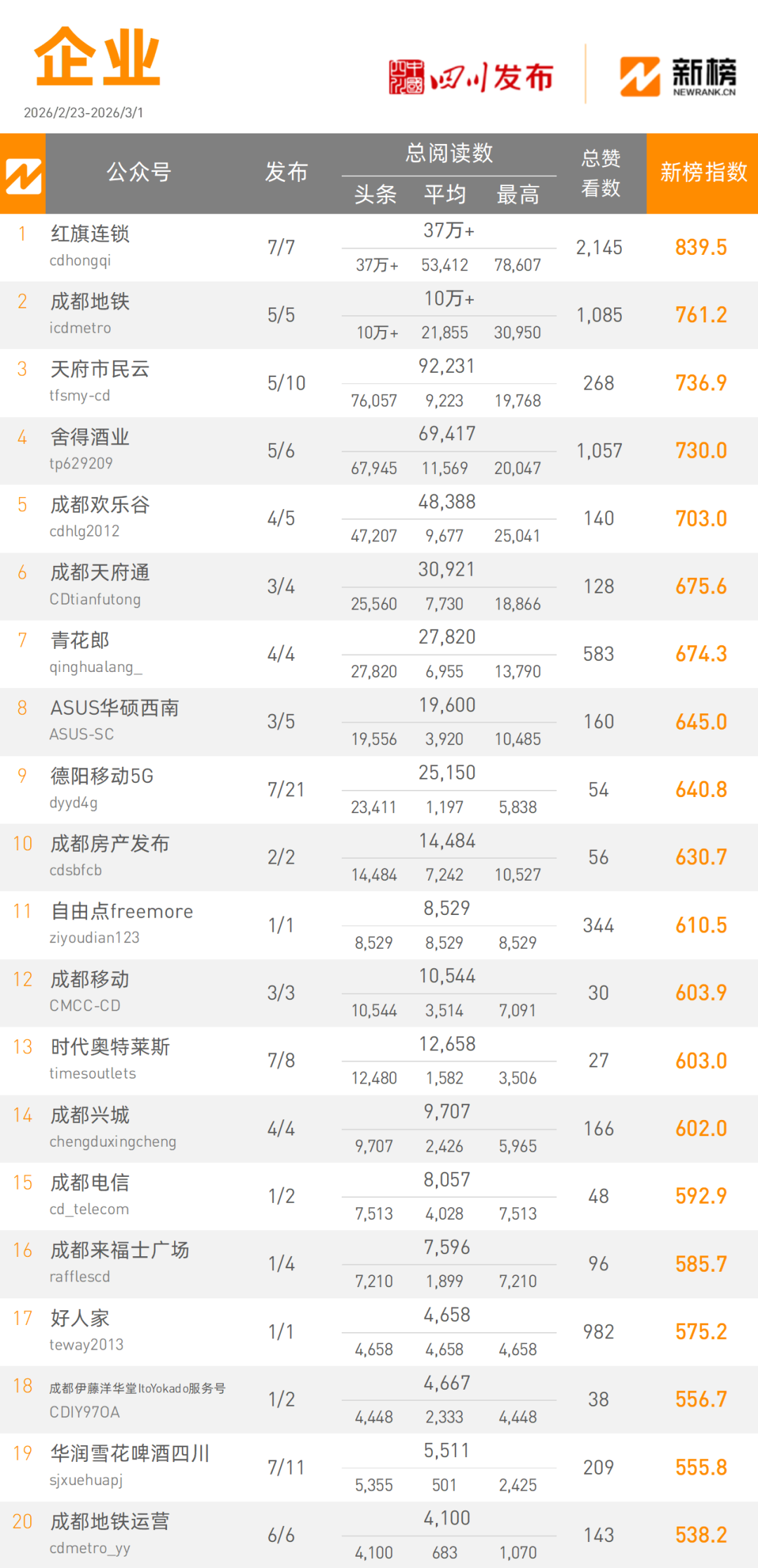 “红旗连锁”本周发文7篇,以370000+次阅读量总数坐上企业类榜单头把交椅,“成都地铁”本周发文5篇,以100000+次阅读量总数位居企业类榜单次席。