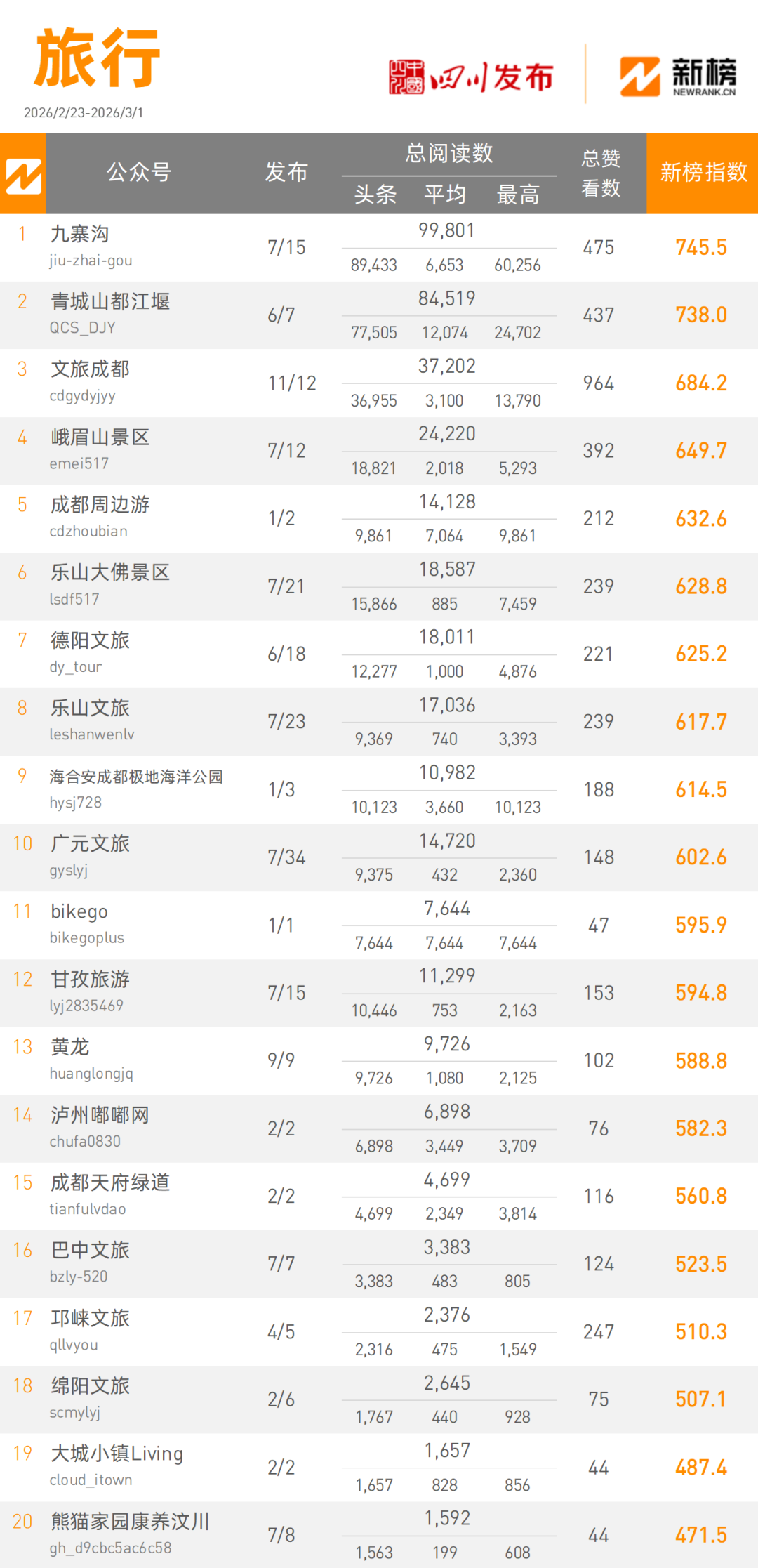 “九寨沟”本周以99801阅读量总数,745.5的新榜指数摘得旅行类榜单桂冠,“青城山都江堰”本周以84519阅读量总数,738.0的新榜指数将旅行类榜单榜眼收入囊中。