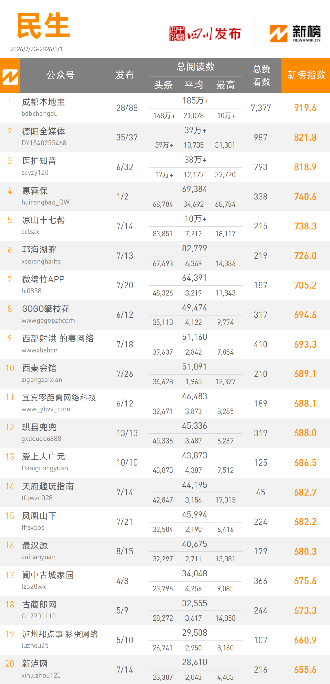 “成都本地宝”本周以1850000+次阅读量总数摘得民生类榜单桂冠,“德阳全媒体”本周以390000+次阅读量总数,821.8的新榜指数占据民生类榜单第二名。