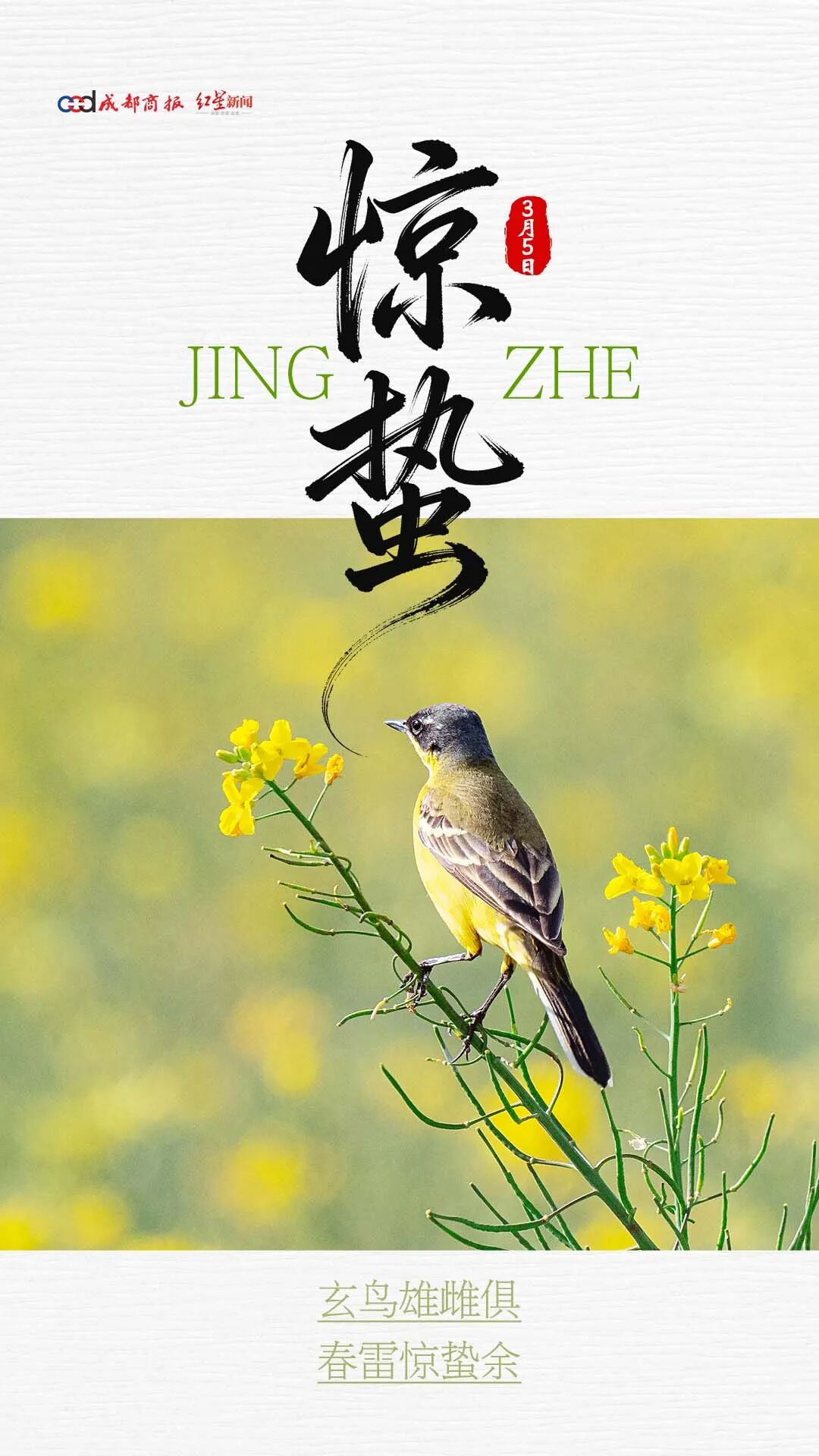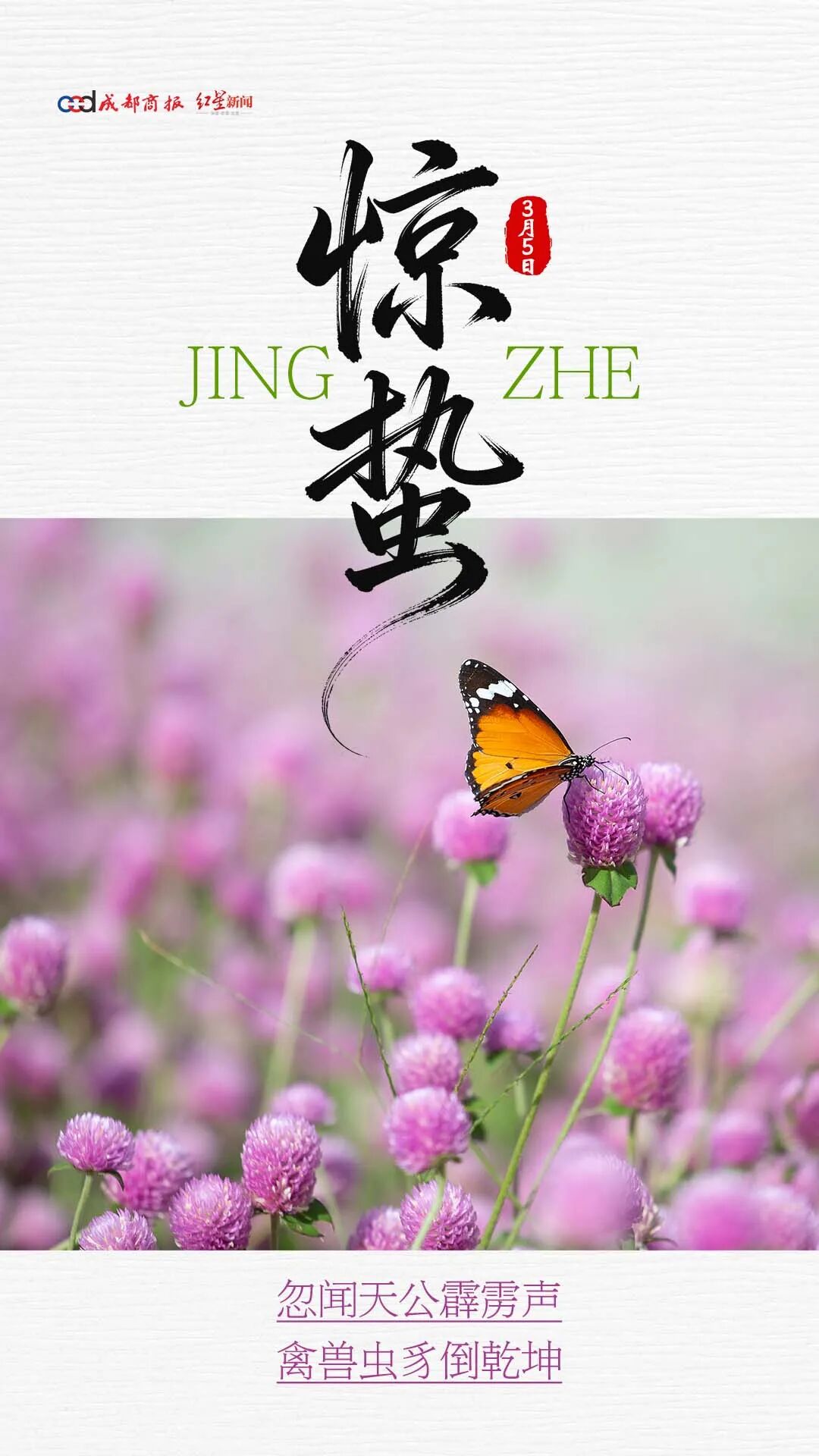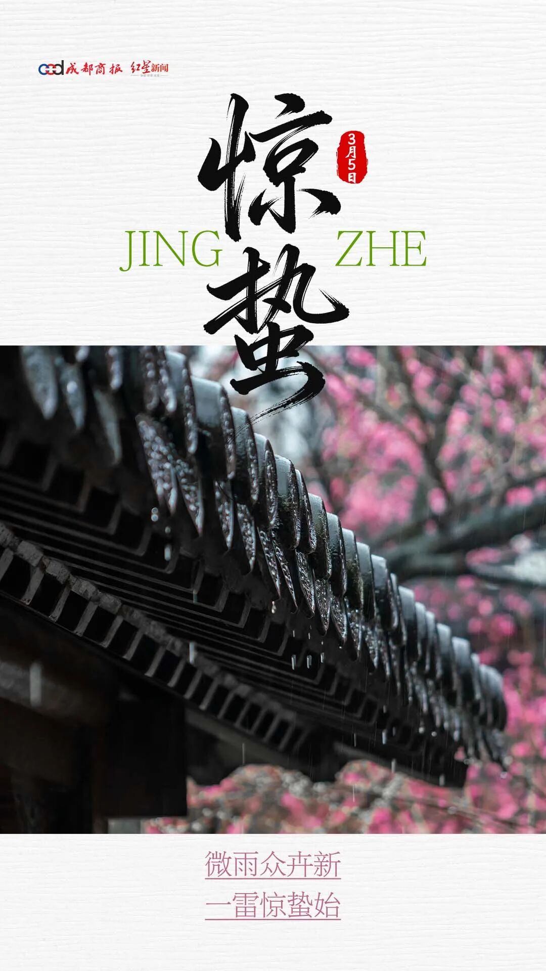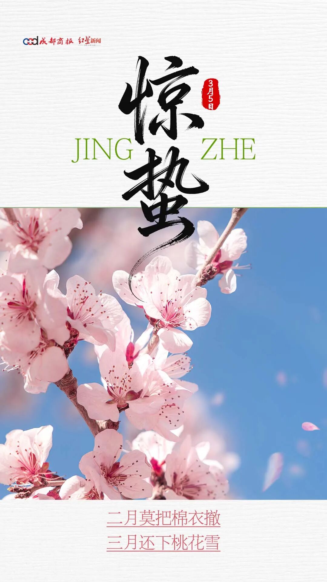 惊蛰是春季的第三个节气,惊蛰标志着仲春时节开始;融融春光中,繁花似锦,多地迎来赏花好时节;此时节,气温波动较大,应适当增减衣物,避免受凉感冒。