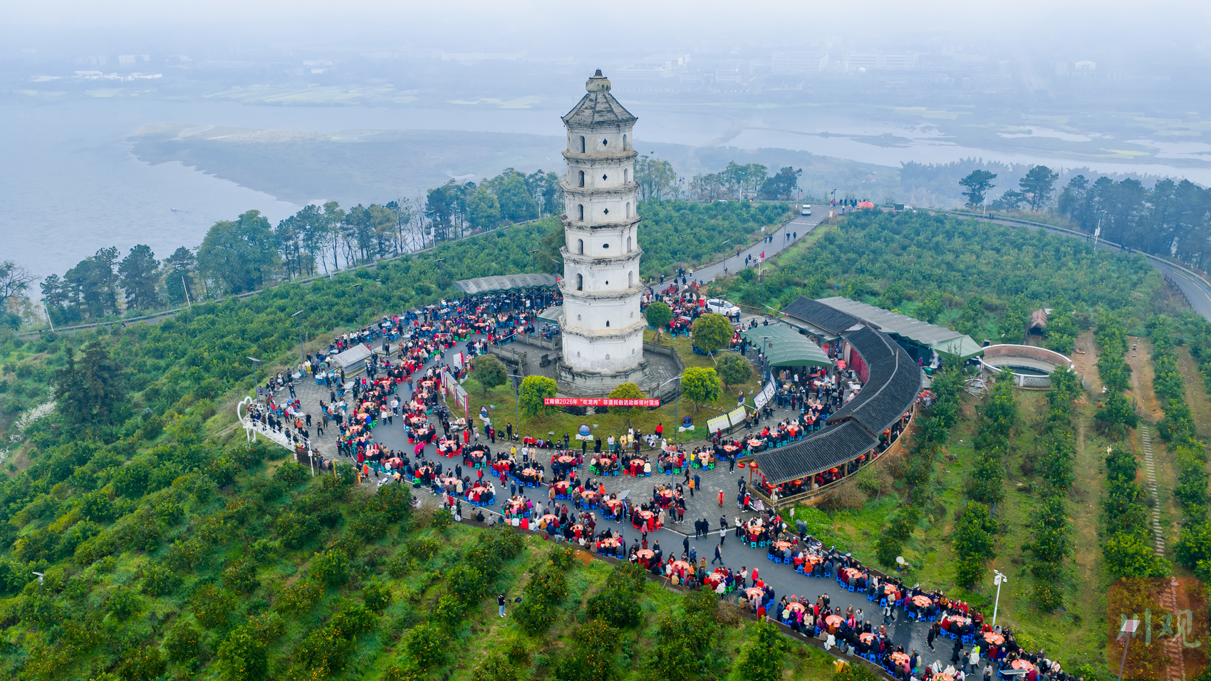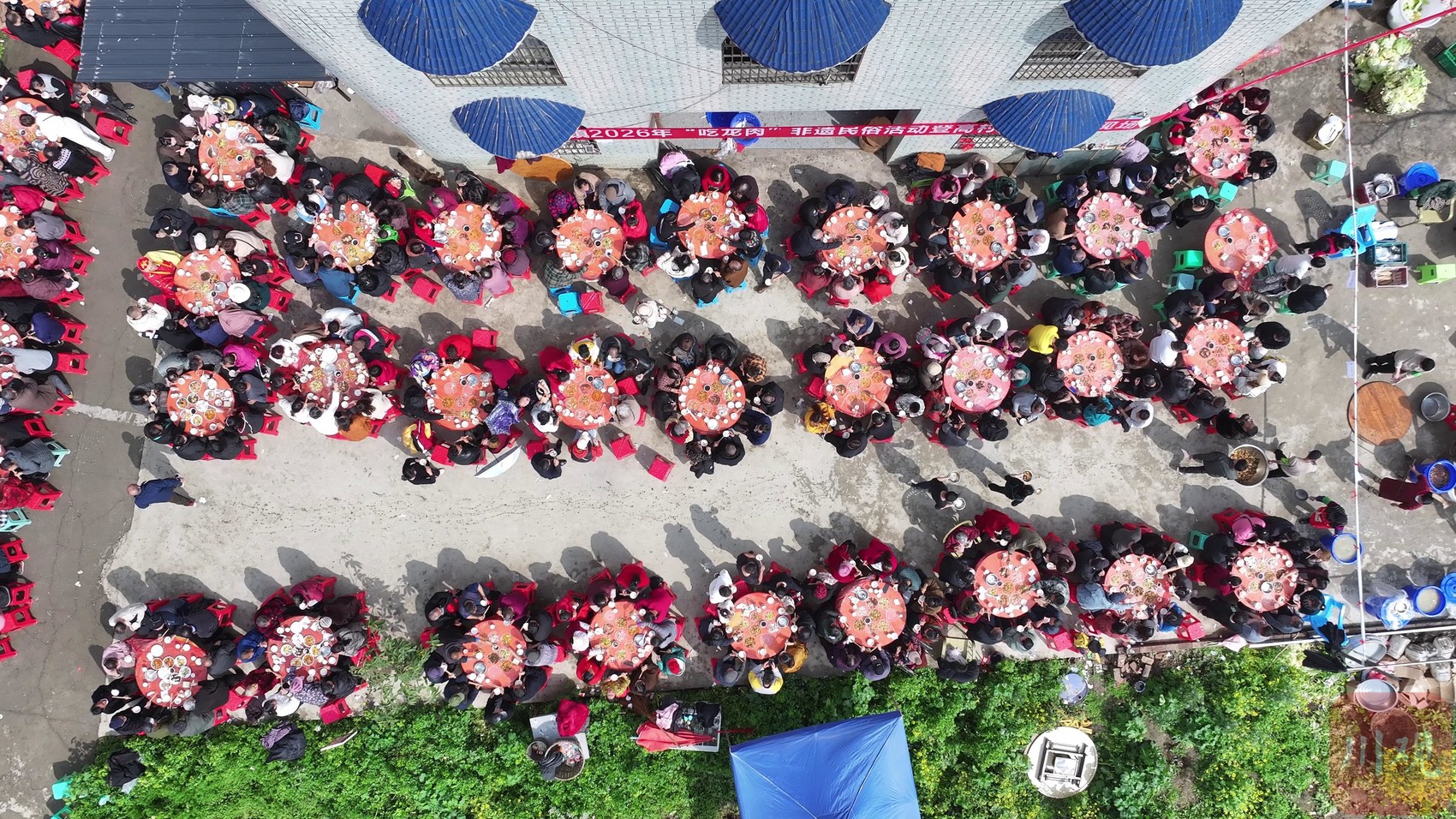 中午时分,随着一声中气十足的“开席咯”,全镇1400桌宴席同时开动。从高空俯瞰,蜿蜒的宴席长阵宛如一条长龙,盘踞在江南镇的广场与街巷之间,红桌连绵、人头攒动,场面蔚为壮观。