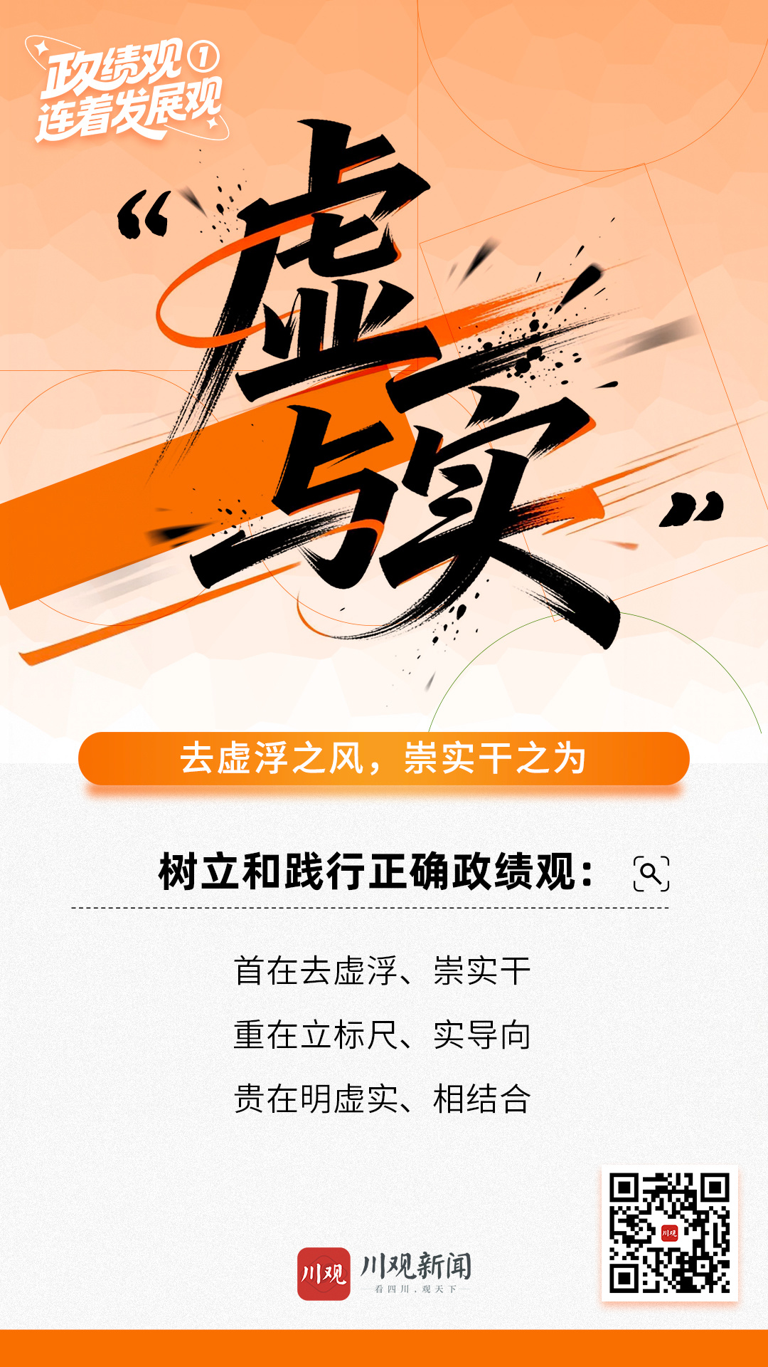 树立和践行正确政绩观,贵在明虚实、相结合。“虚”与“实”,是干事创业必须答好的辩证考题。这里的“虚”,不该是虚无无为、弄虚作假,而应是理念引领、思想统一、战略谋划;这里的“实”,就是实事求是、真抓实干、落地见效。正确处理二者关系,就要以实筑基、以虚领实,虚实结合、久久为功。既要抓实就业、教育、医疗、养老等群众看得见、摸得着、得实惠的民生实事,以即时成效温暖民心、凝聚合力;也要甘坐“冷板凳”、肯下“慢功夫”,扎实做好生态保护、科技创新、基层治理、人才培育等打基础、利长远的工作,多积尺寸之功、多做潜绩之事。