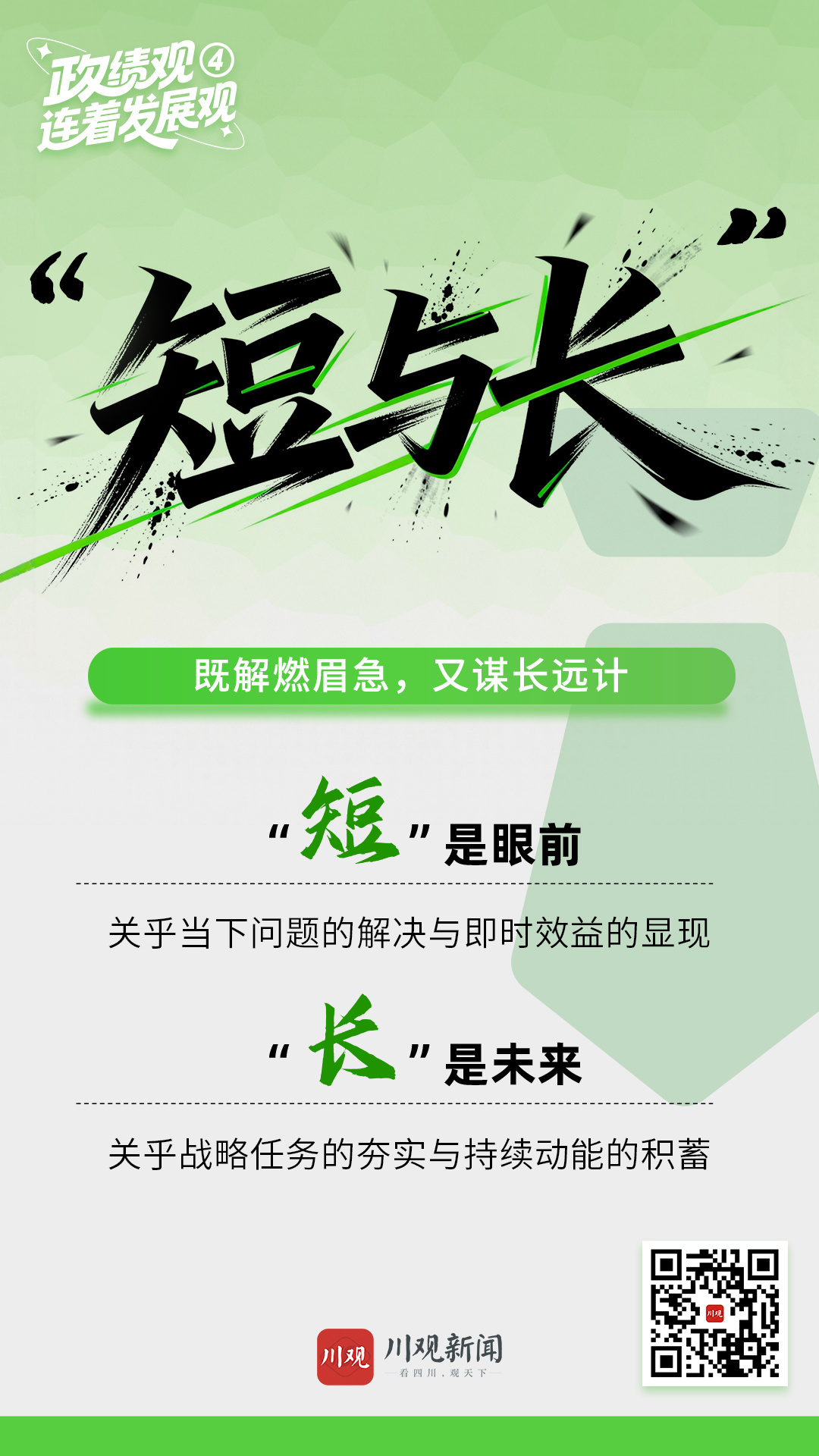 “短”与“长”,是观察、谋划和推动发展的基本时间维度。“短”是眼前,关乎当下问题的解决与即时效益的显现;“长”是未来,关乎战略任务的夯实与持续动能的积蓄。二者并非割裂对立,而是辩证统一的整体,厘清这层关系,想问题、办事情才能更有章法、更见实效,真正做到一张蓝图绘到底。