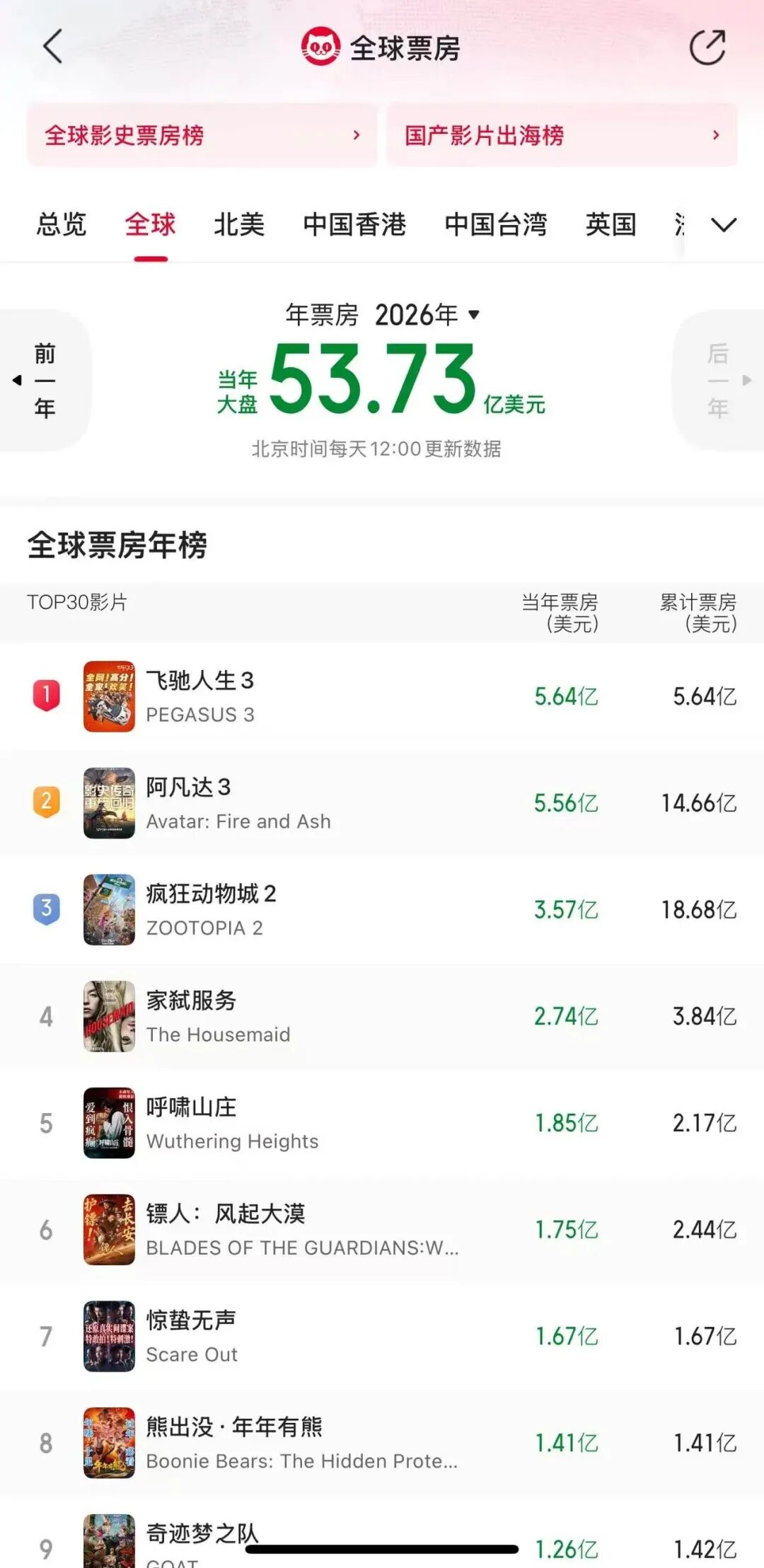 从全球范围内来看,国内2026年的票房位居前列。据灯塔专业版数据,截至3月1日18点54分,2026年年度中国电影总票房(含预售)突破100亿元,暂列全球单一市场票房第一。