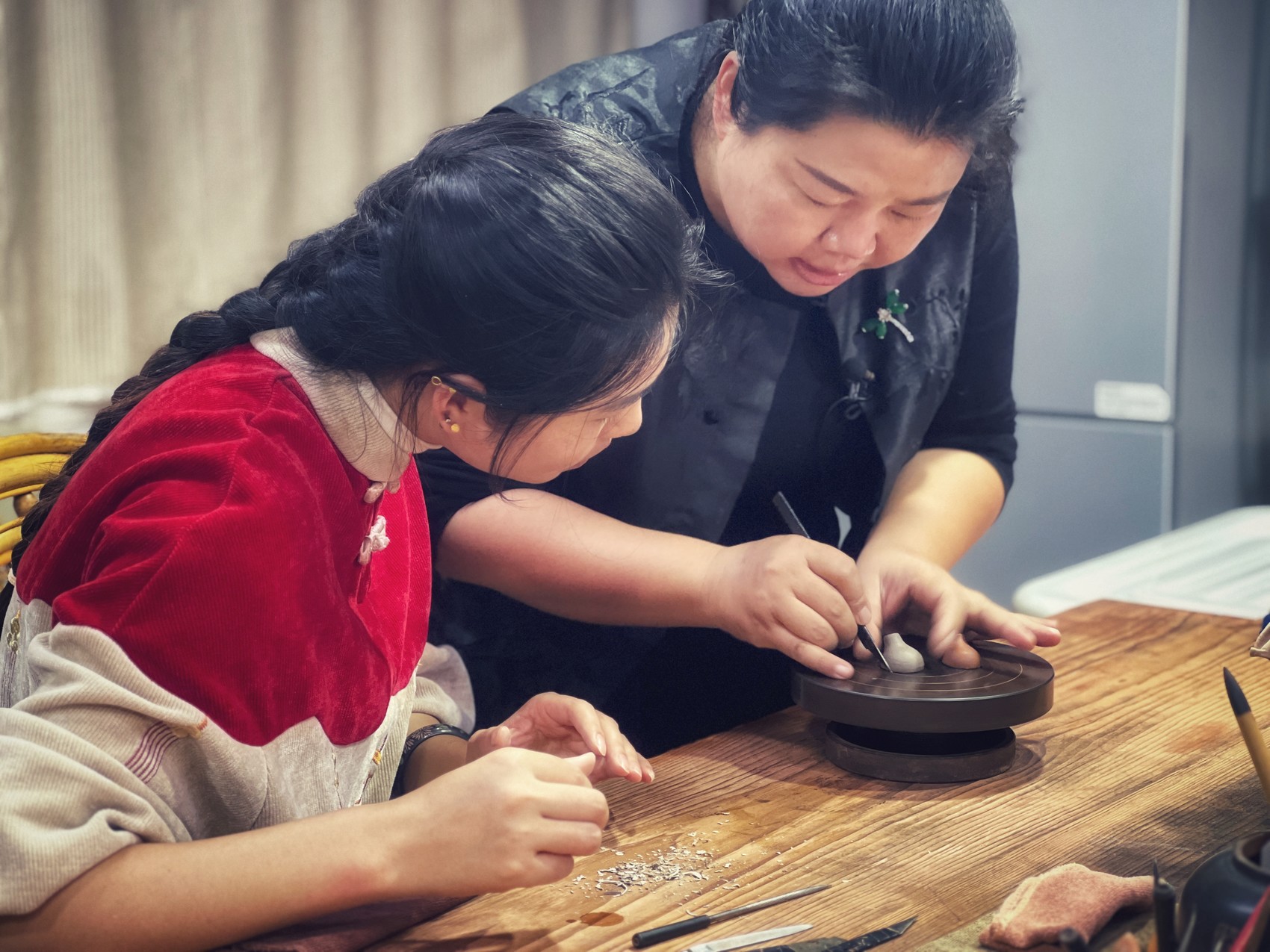 田静(右)讲解紫陶技艺。(受访者供图)