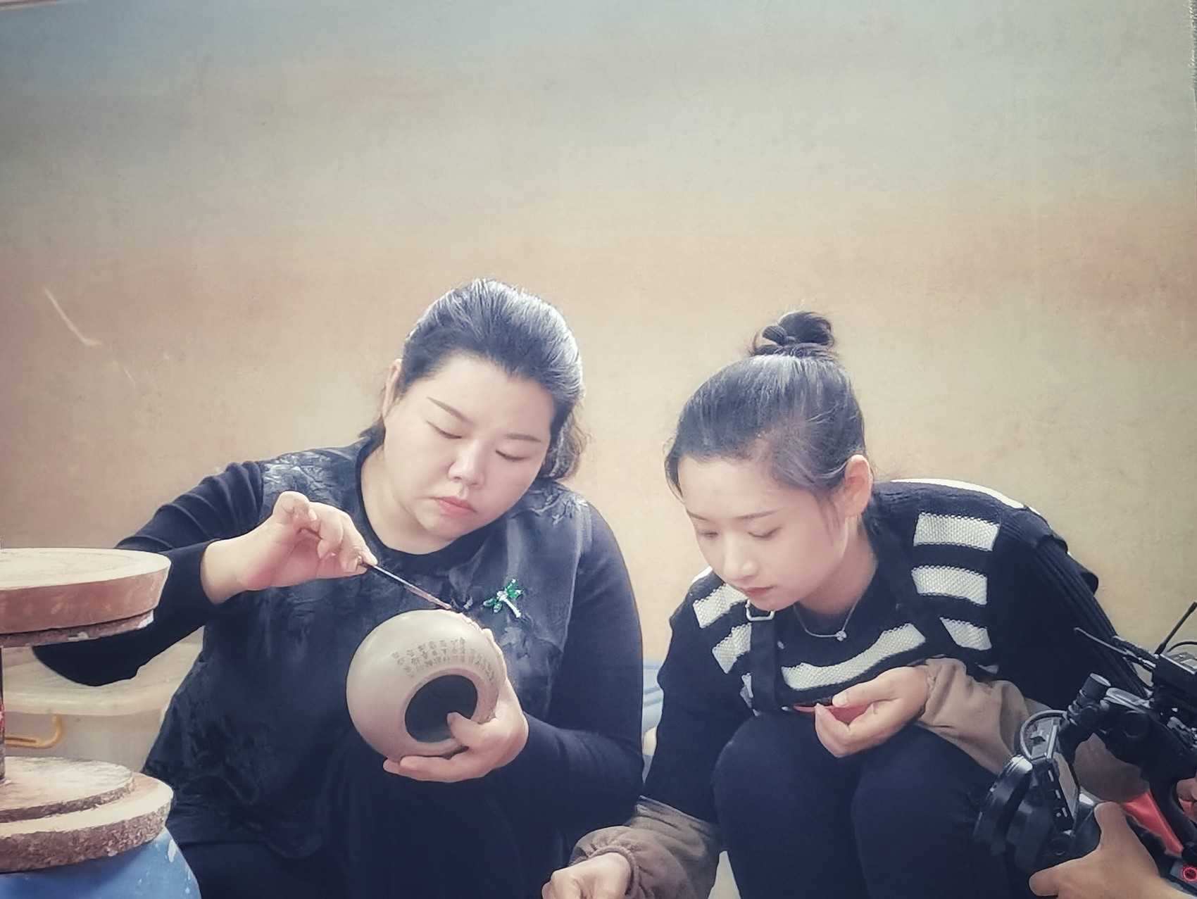 田静(左)讲解紫陶技艺。(受访者供图)