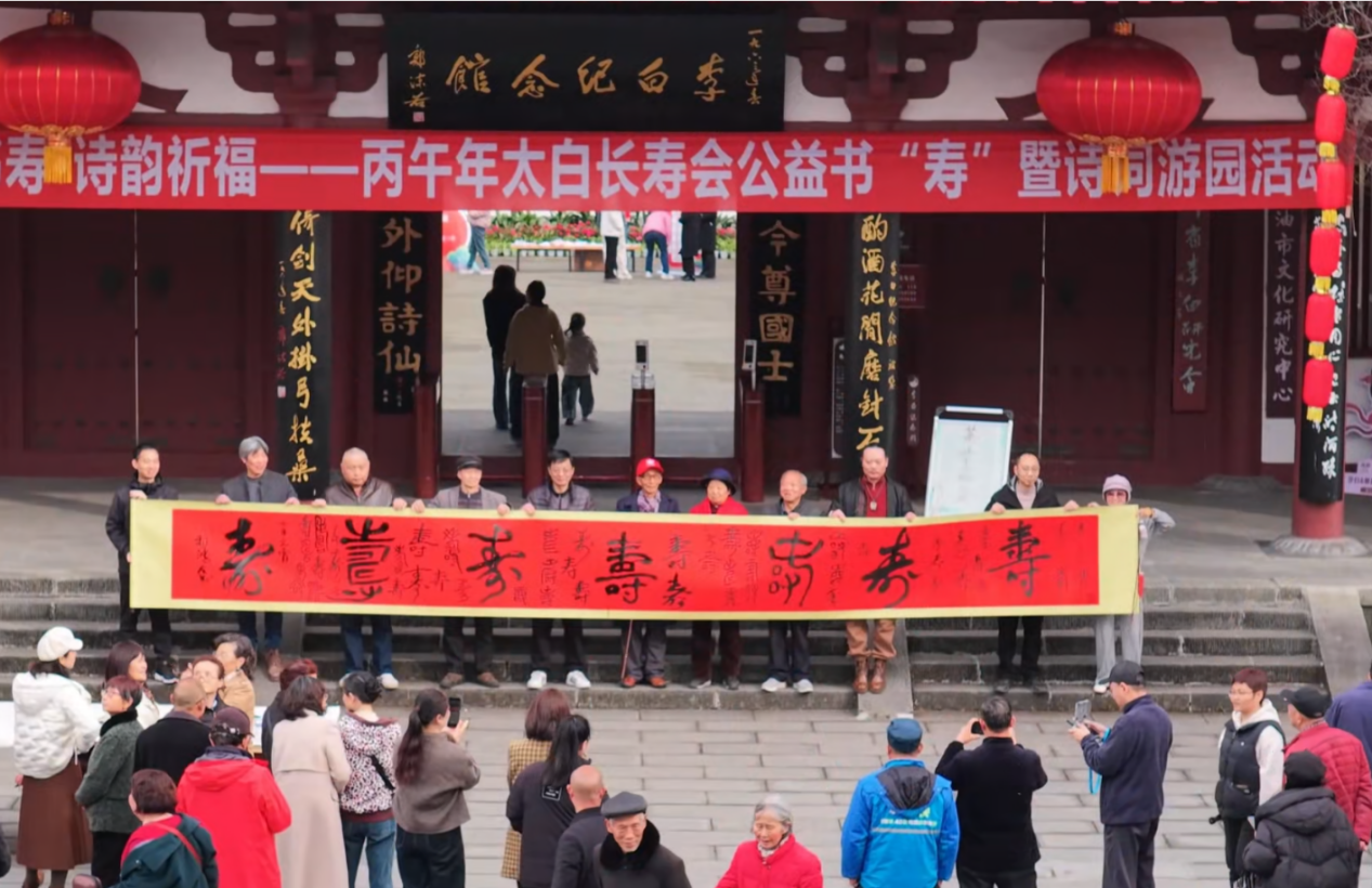 3月3上午,李白纪念馆内墨香阵阵,一场别开生面的公益书“寿”暨诗词游园会率先为长寿会“热身”。下午,青莲镇举行太白长寿会请架仪式,在太白祠上香鸣炮、庄重起架,将太白架顺利入驻陇西院。