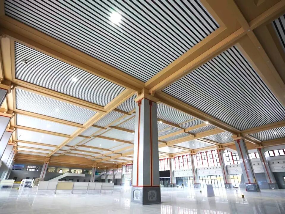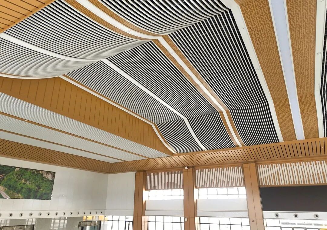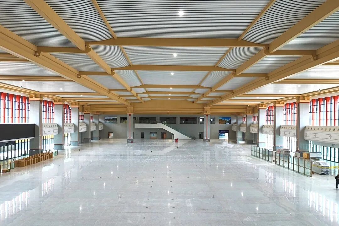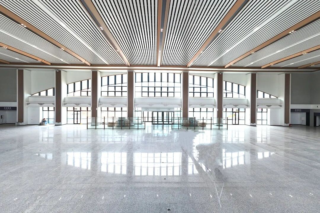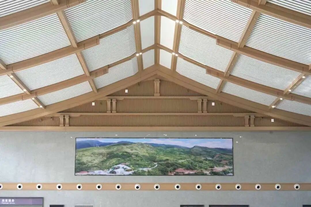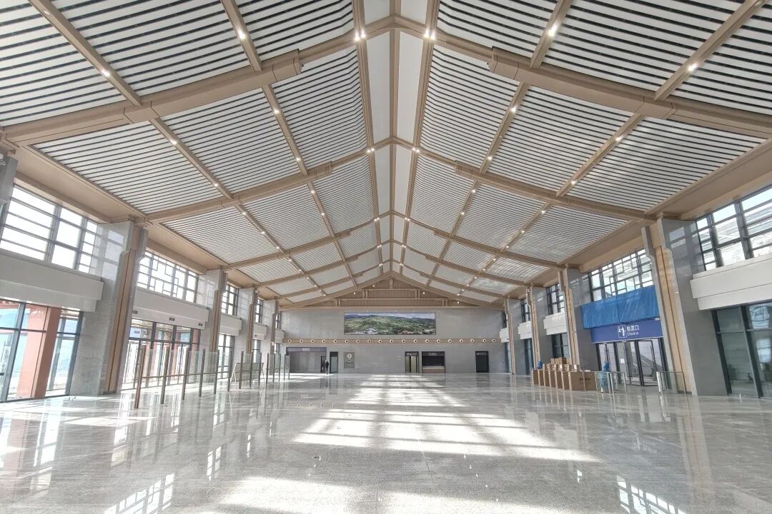 候车大厅以汉代风格为基调,通过天花板叠层错落的线条模拟秦岭龙脉的巍峨,整体造型平直舒展,檐角微翘的屋面与朴实的脊饰构件,既呼应商洛“秦楚咽喉”的历史角色,又营造出宁静宜人的现代交通空间。