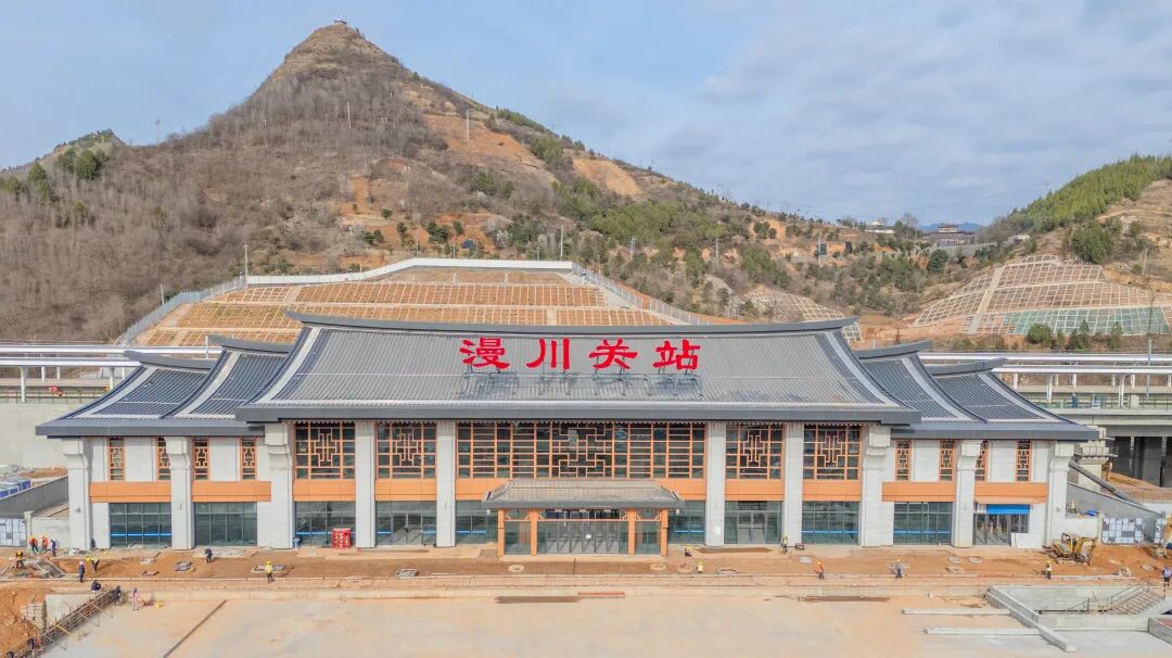 漫川关站位于陕西省商洛市山阳县。站房以“古今交汇集美景,南北交融铸不凡”为建筑创意,屋顶形态提取自古镇错落层叠的屋顶群,体现出古镇建筑鳞次栉比的壮观景象。